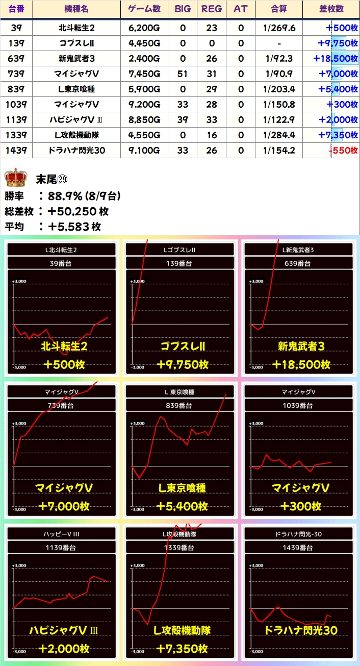 ③⑨のつく日お馴染みとなっている末尾㊴ですが、この日も素晴らしい結果を記録しており、平均+5583枚と圧倒的な出玉に!