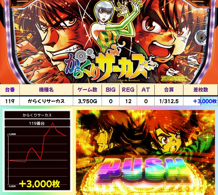 本日のからくりサーカスは+3000枚の台を確認できたものの稼働不足で全体的に不発気味…。