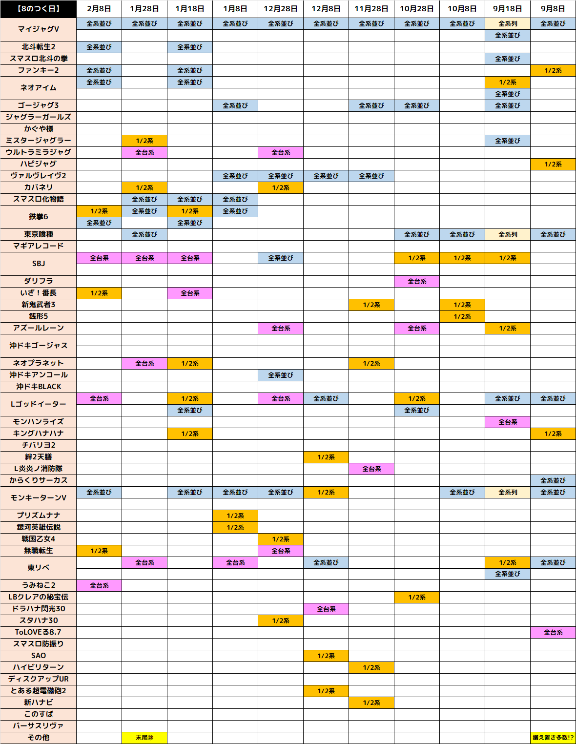 8のつく日はポスターを見ても分かるように山佐機種が盛り上がる一日となっており、過去の傾向を見てもやはり山佐機種が強めとなっております。もちろん、山佐機種以外にもチャンスはあり、様々な機種の仕掛けに期待できる一日です。