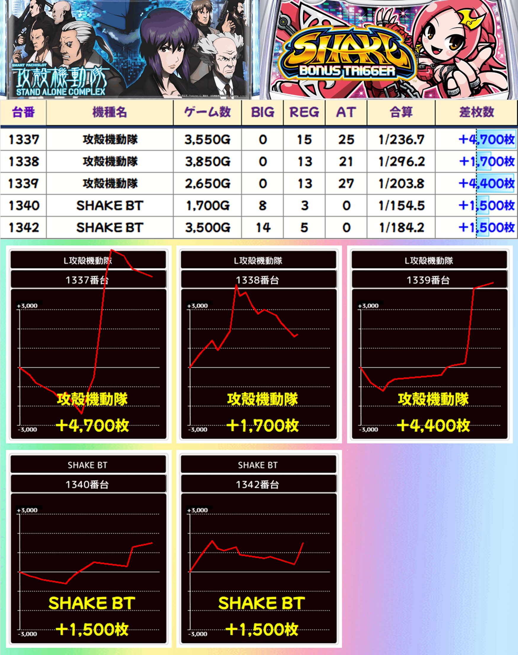 SHAKE BTは3台全てがプラスとなり、+1500枚の出玉を2台確認。攻殻機動隊からは+4700枚や+4400枚の大量出玉が飛び出しました!