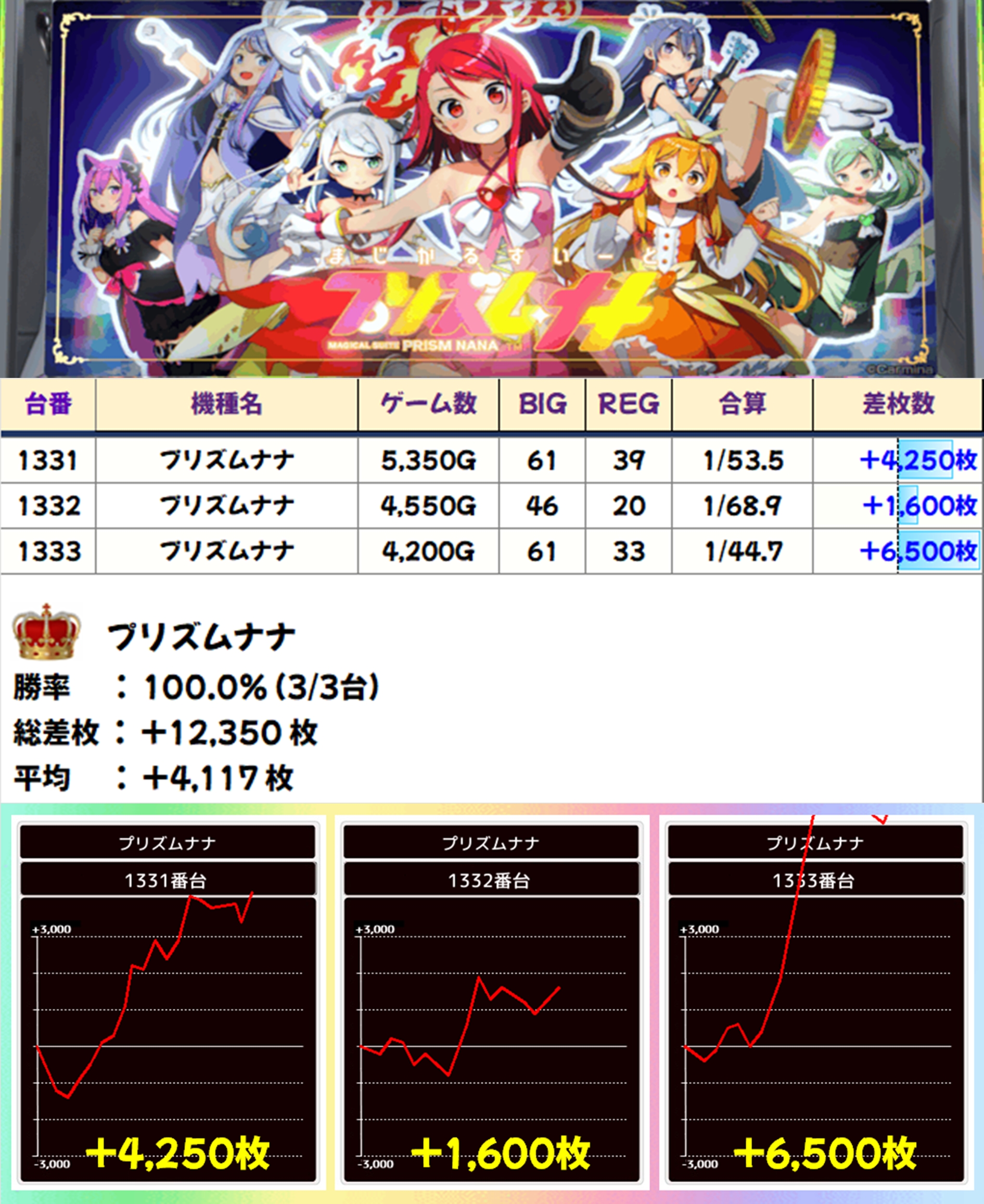 かぶぱポストにダブルヒントがあったプリズムナナは+6500枚や+4250枚の大量出玉が出現し、残りの1台もプラスに。平均で+4000枚を超える見事な結果となりました!