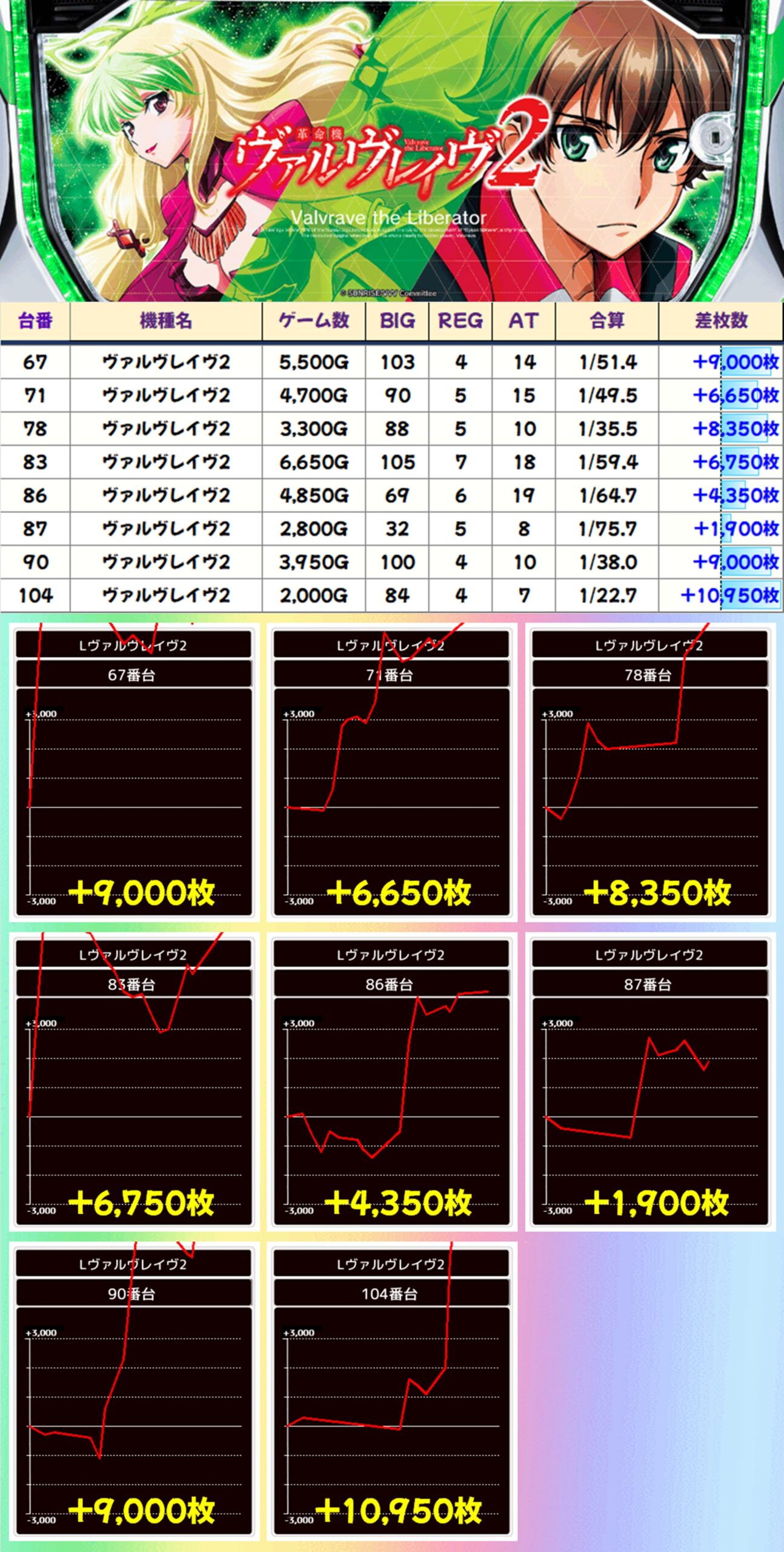 新ポスター8日目となったヴァルヴレイヴ2からは、+10950枚の万枚オーバーが炸裂!さらに+9000枚や+8350枚などの爆発台も確認することができました!