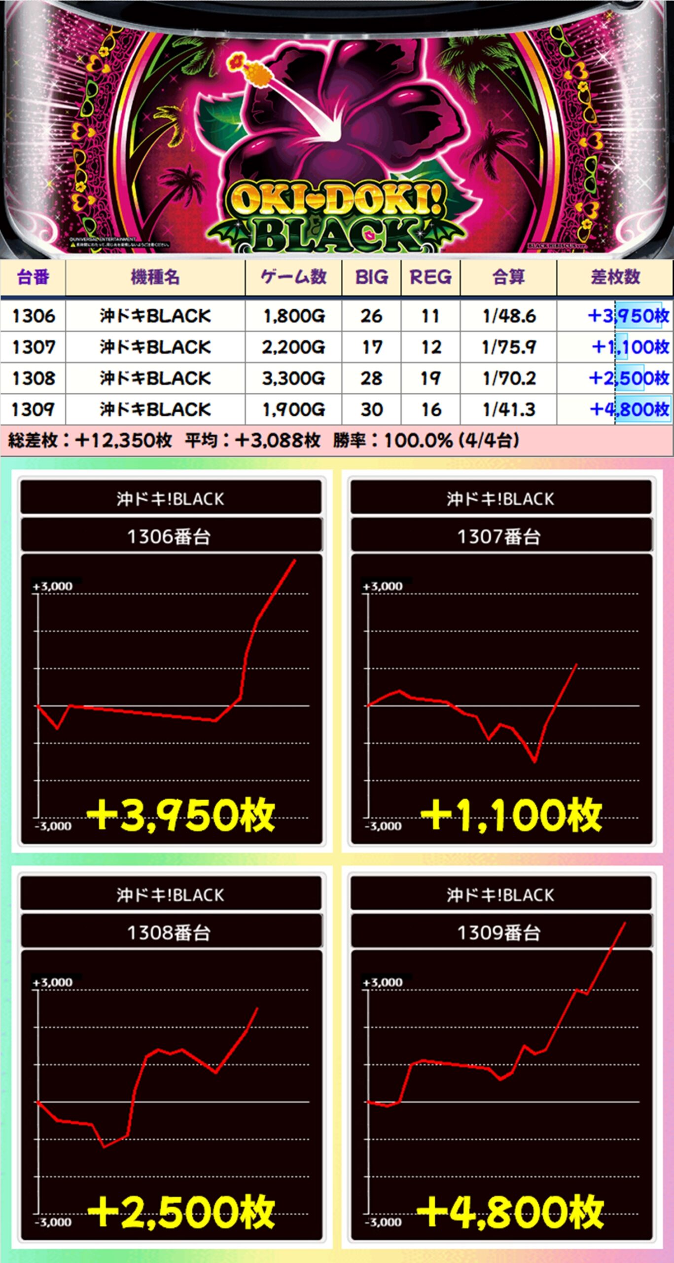 【4台並び】沖ドキBLACK(1306-1309番台)→平均+3,088枚