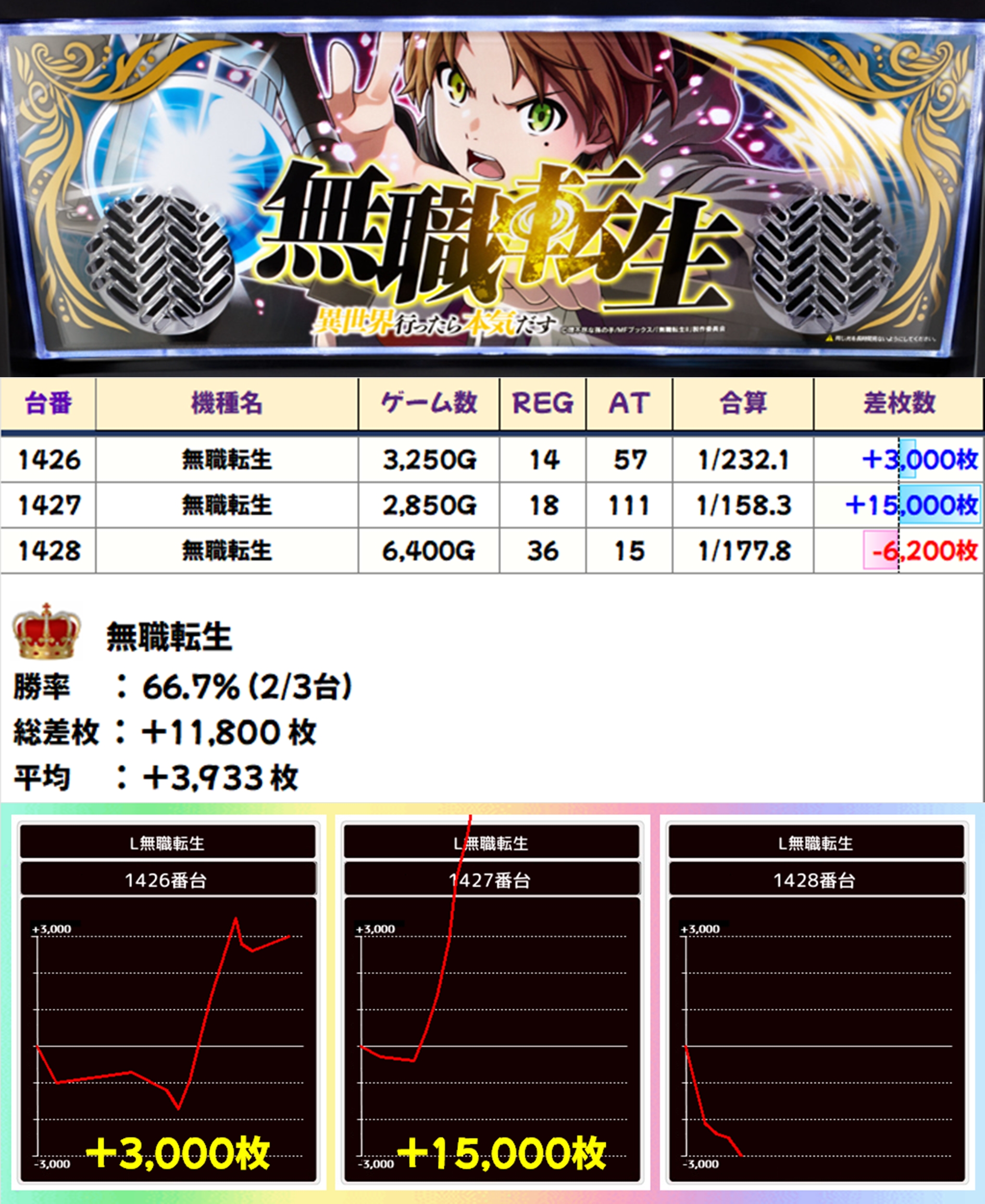 +15000枚の爆発により、無職転生の平均も優秀な結果となりました。