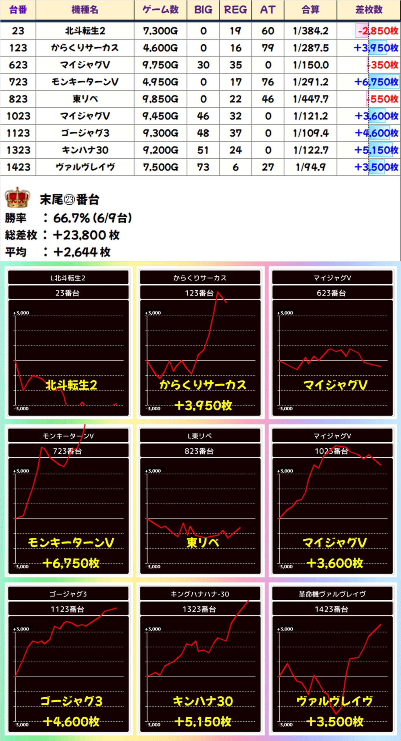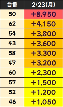 末尾㉓番台(6/9台+)→平均+2,644枚