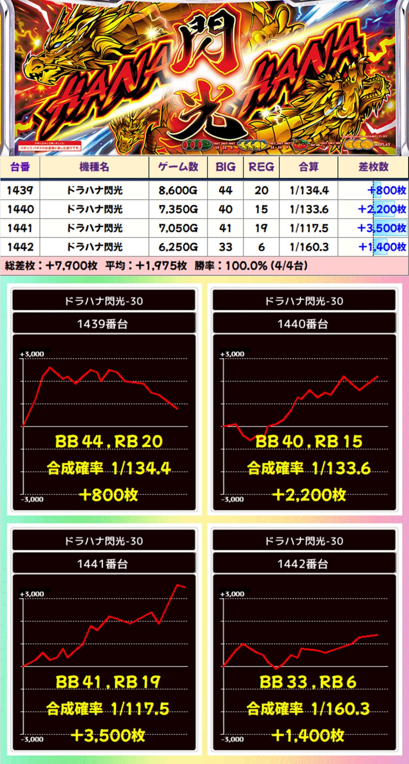 【4台並び】ドラハナ閃光(1439-1442番台)→平均+1,975枚