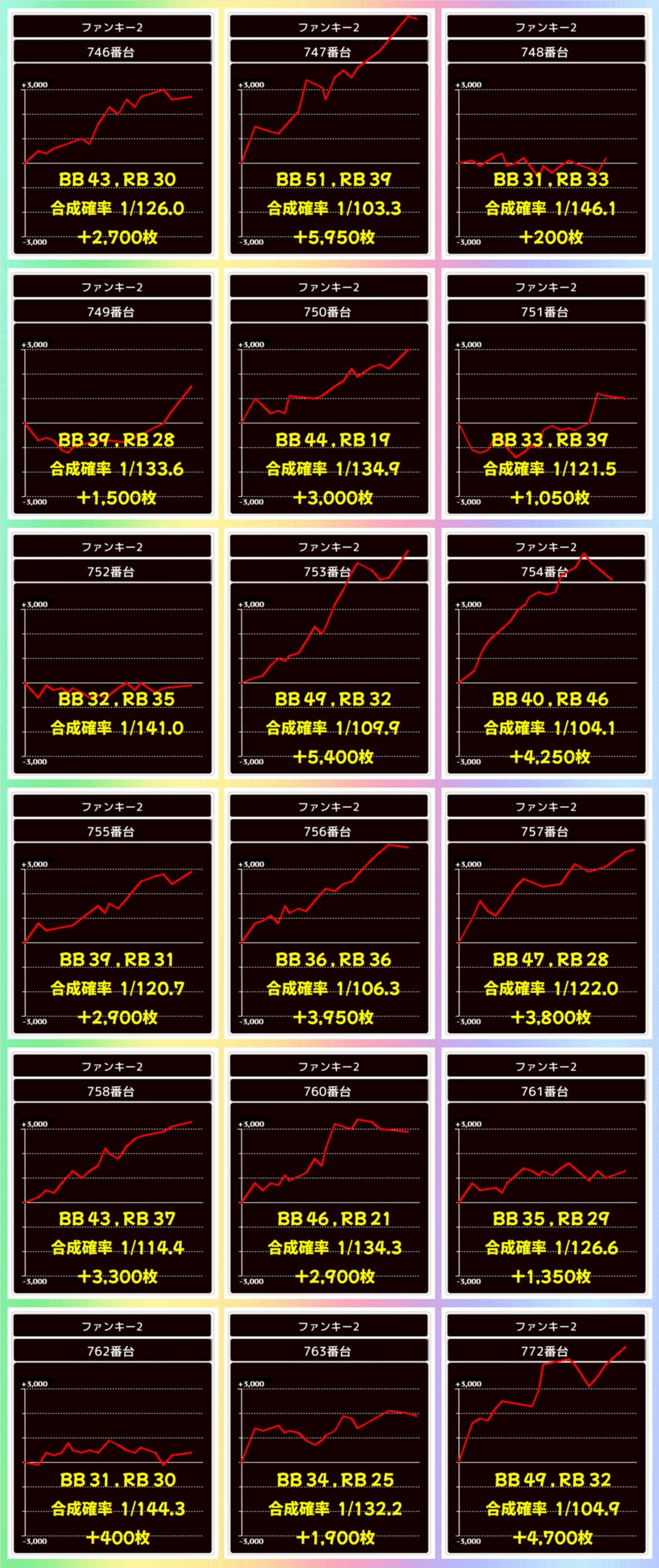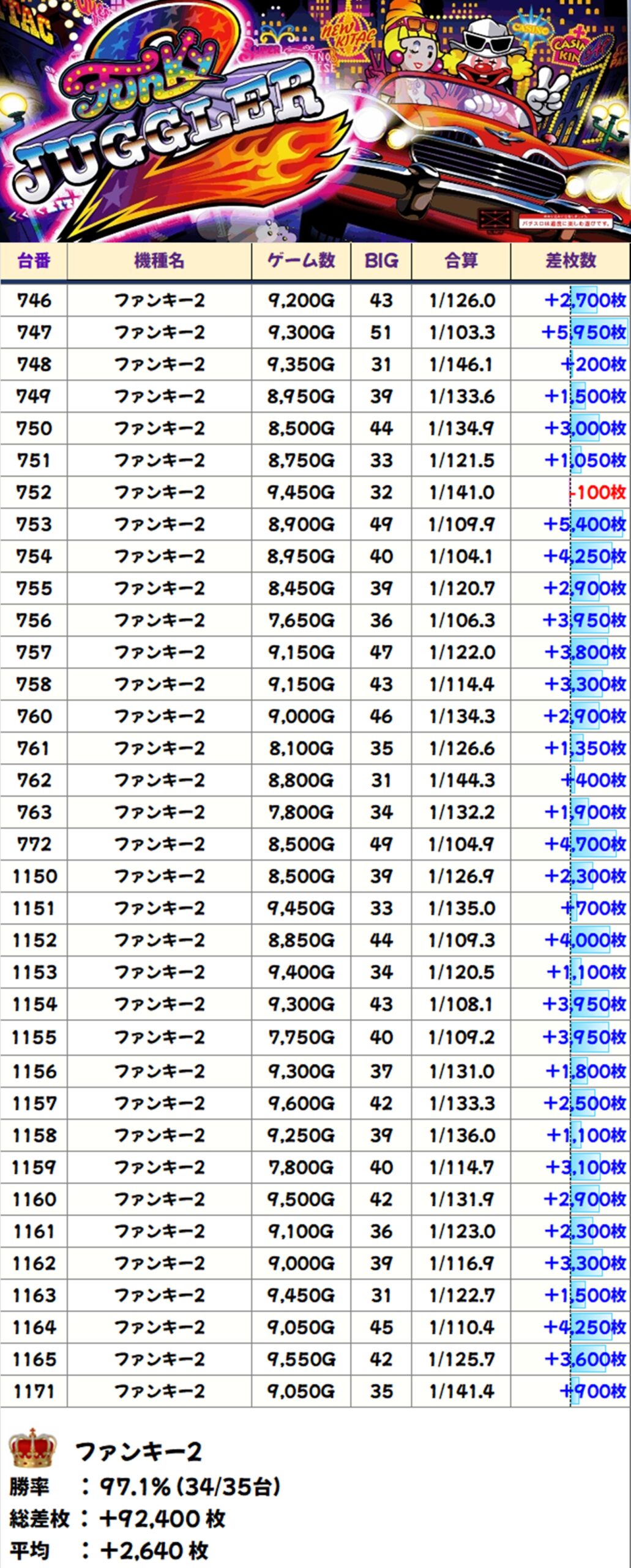 かぶぱポストにヒントがあったファンキー2の全35台(759番台は稼働停止)が全台系濃厚で、1台が僅かなマイナスとなったのみで、34台がプラスに。