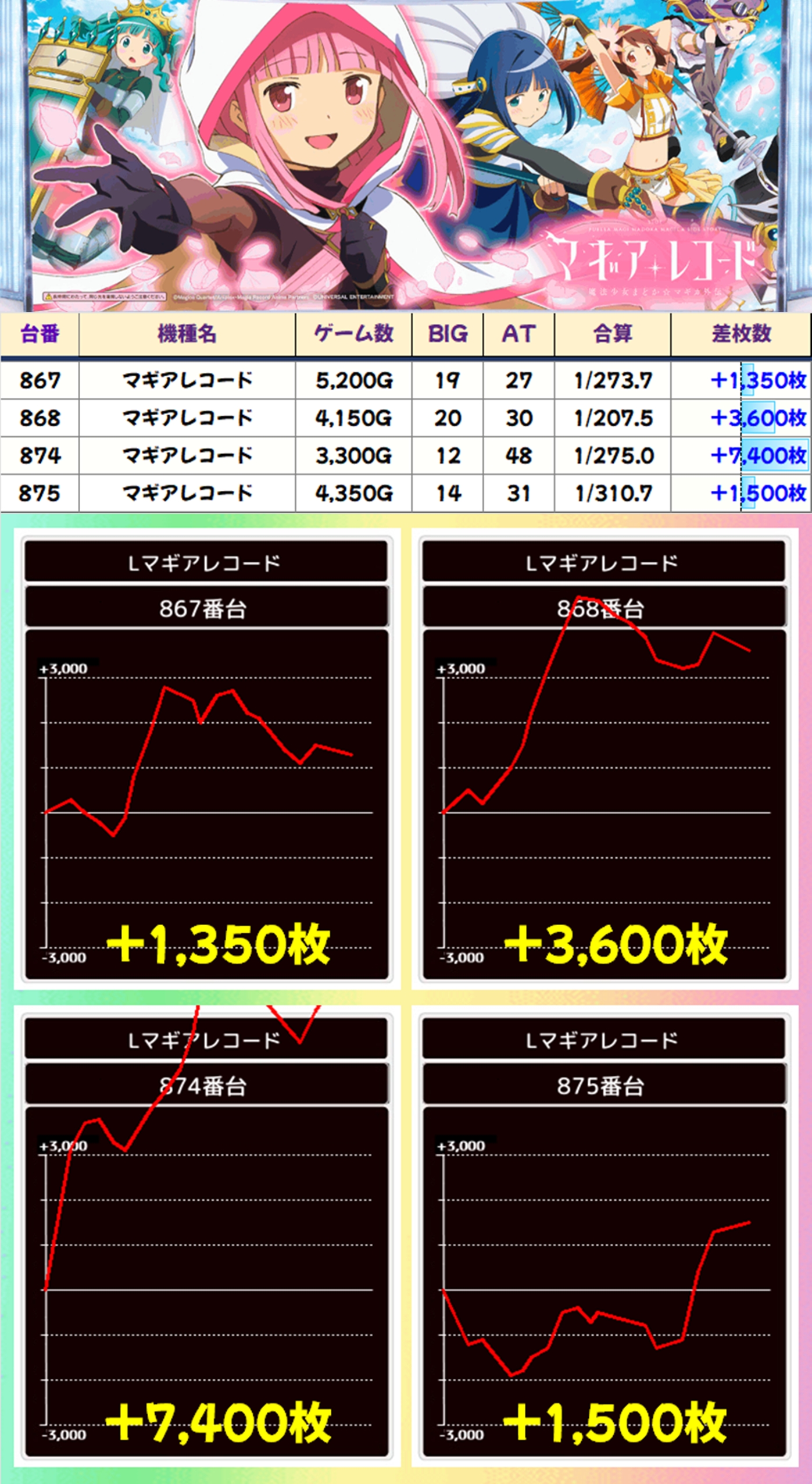 マギアレコードからは+7400枚や+3600枚の出玉を確認!