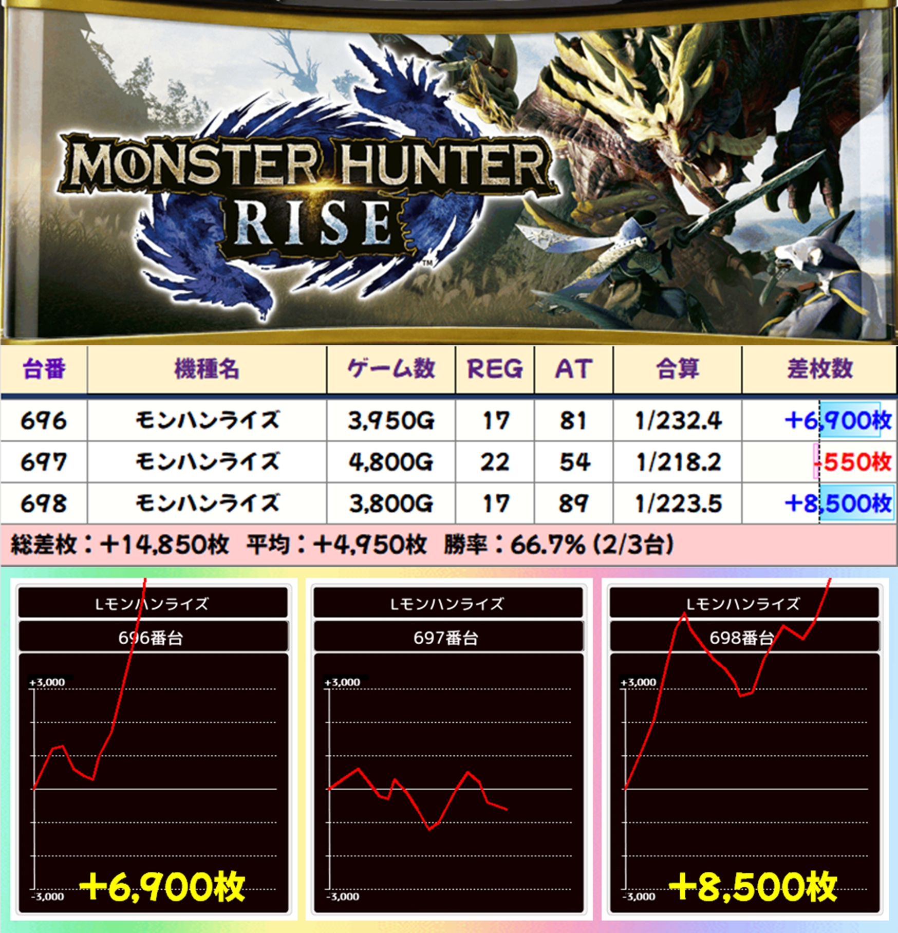 【3台並び】モンハンライズ(696-698番台)→平均+4,950枚