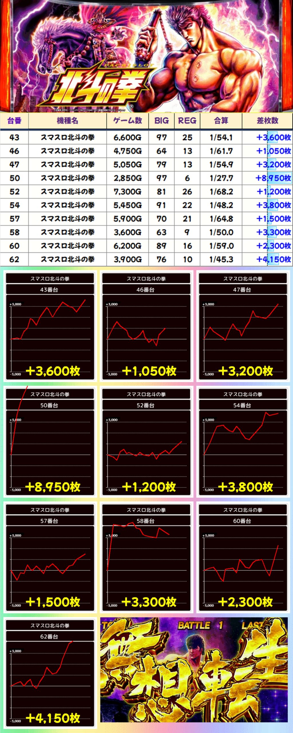 スマスロ北斗の拳からは+8950枚を筆頭にお宝台が多数アリ。+8950枚を獲得した台はスタートから一気に出玉を伸ばしておりましたね!