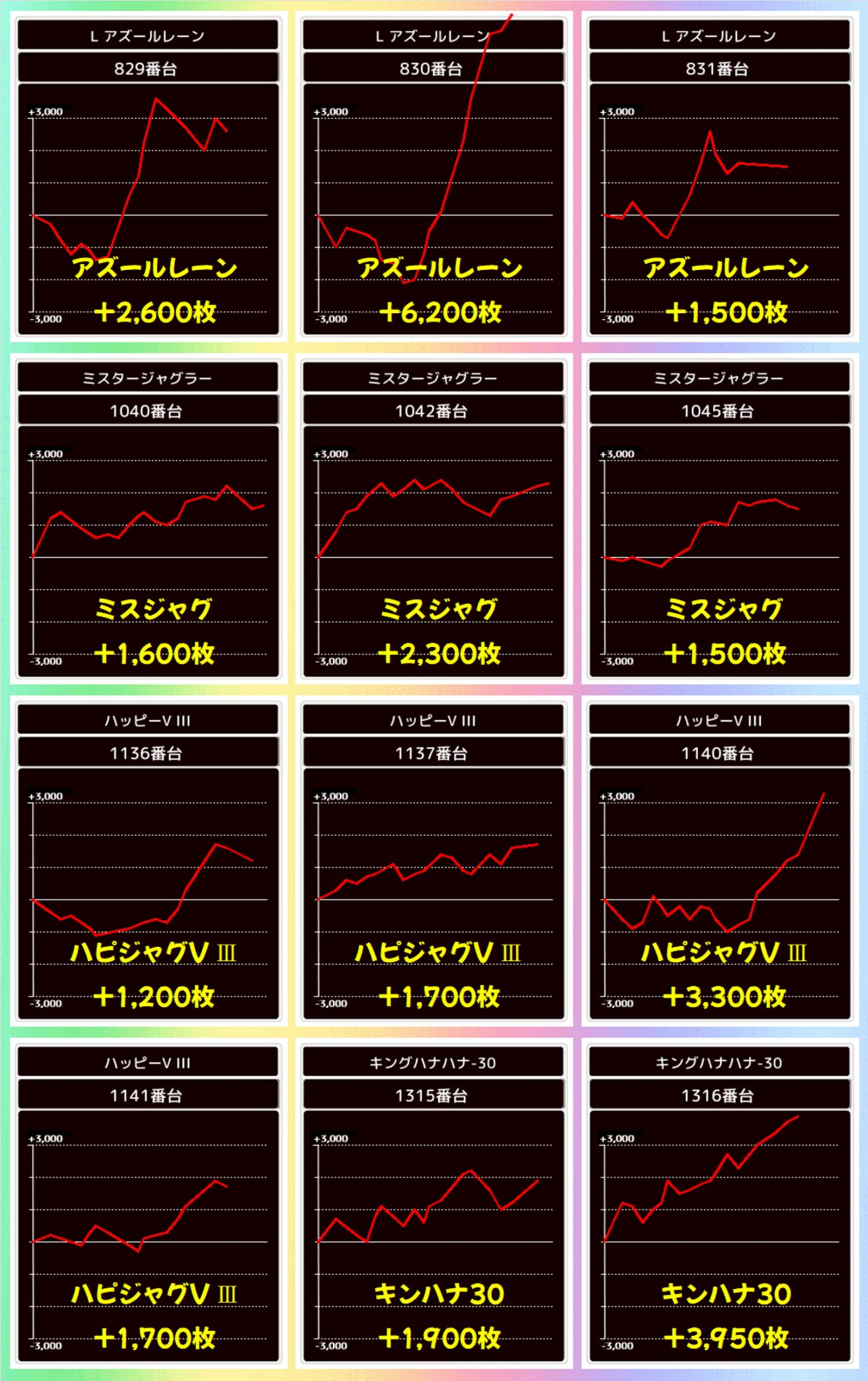 激熱7daysの対象フロアの4Fの機種に加えて、アズールレーン、ミスジャグ、ハピジャグVⅢにも1/2系濃厚の仕掛けが出現。いずれの機種も優秀な出玉が出現し、しっかり半数以上がプラス差枚かつトータルでもプラスとなっておりました!