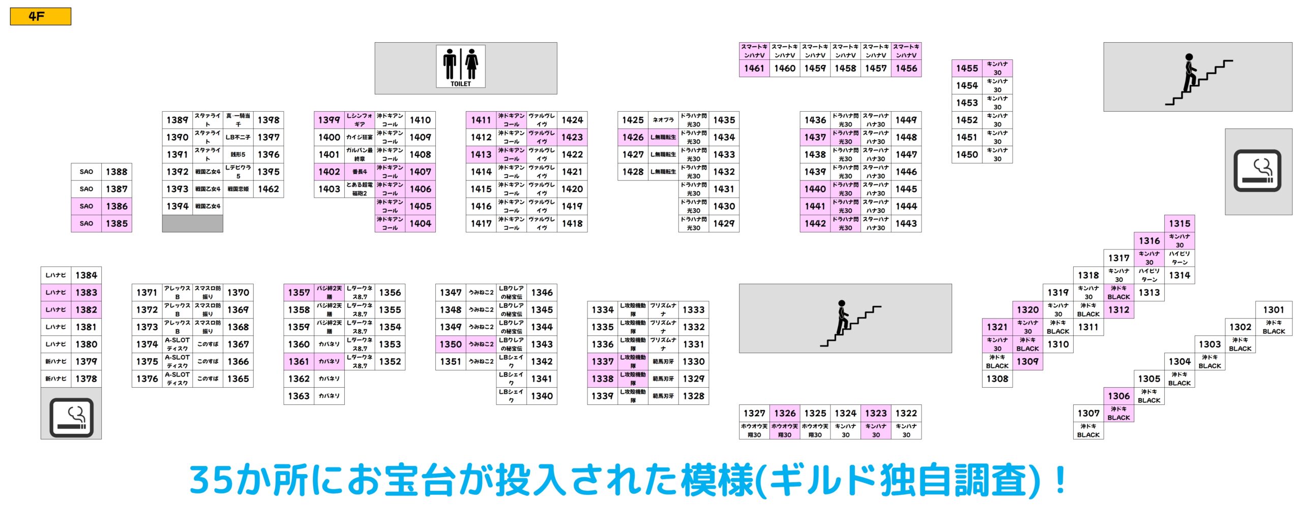 過去の傾向として、27日までは対象フロアに大量のお宝台に期待できますので、明日以降も積極的に4Fフロアを狙ってみるのもアリですね!