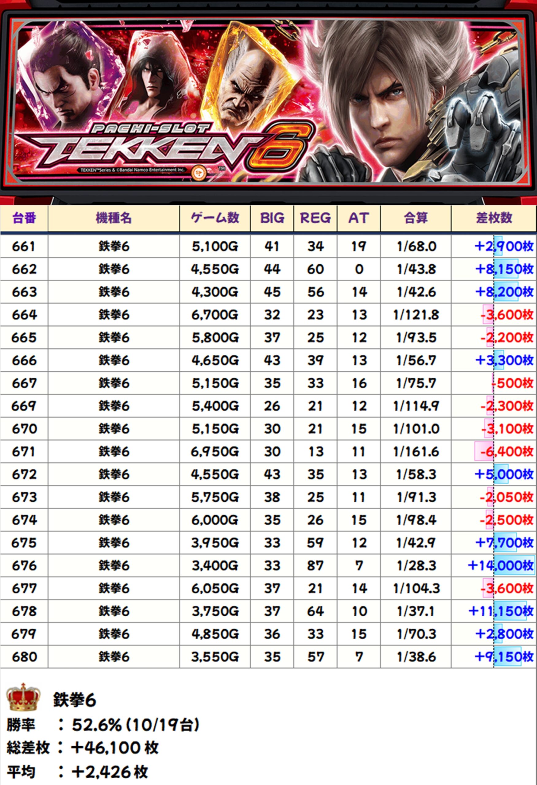 鉄拳6(10/19台+)→平均+2,426枚