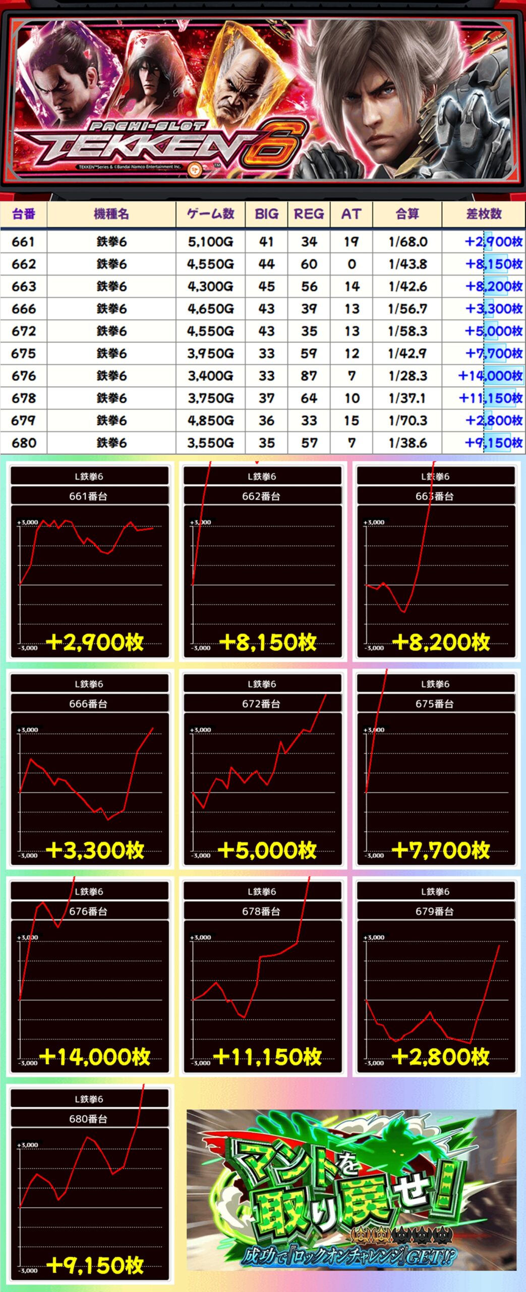 かぶぱポストにヒントがあり、ポスターも出現していた鉄拳6が全台系濃厚。不発の台もありましたが、+14000枚、+11150枚と万枚オーバーも2台飛び出し、その他にも大量出玉が多数出現!