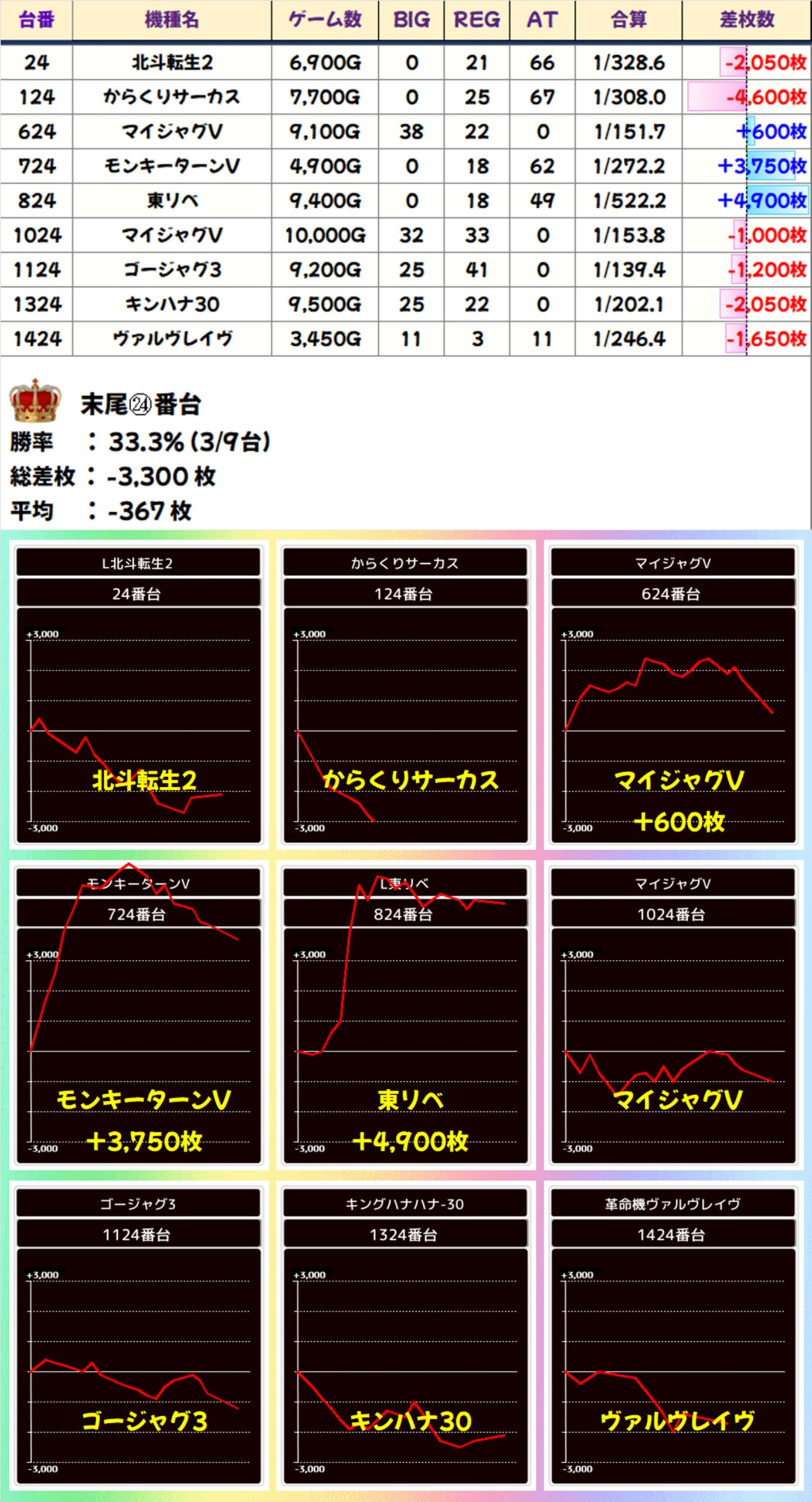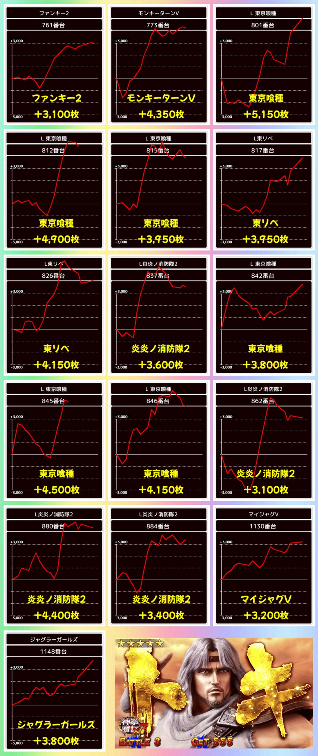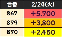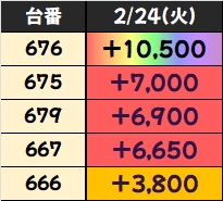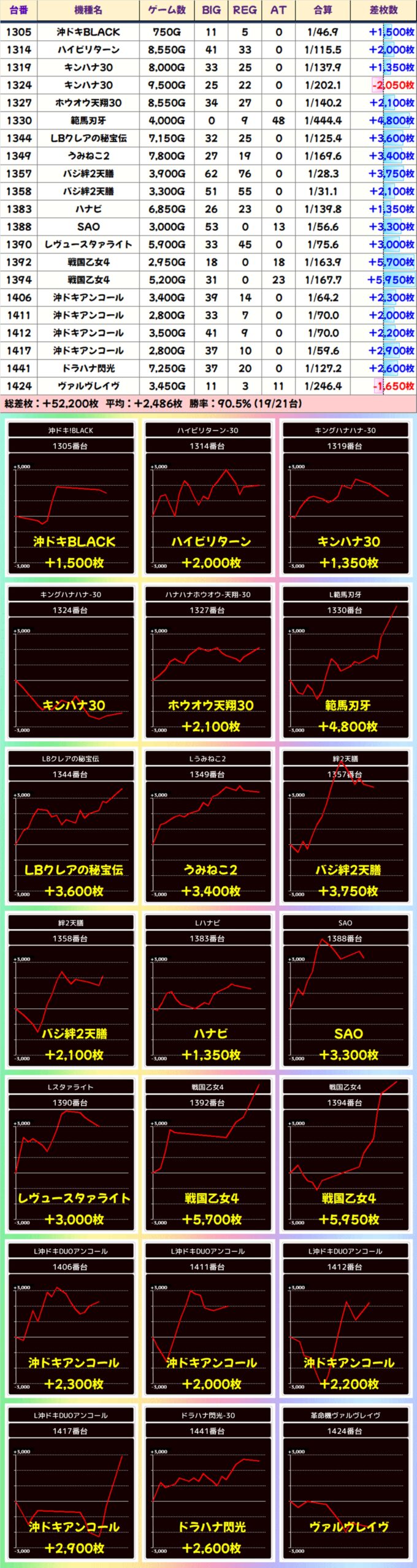 残念ながら不発の台もありましたが、21台中19台がプラスとなり、平均+2486枚の好成績となりましたね!