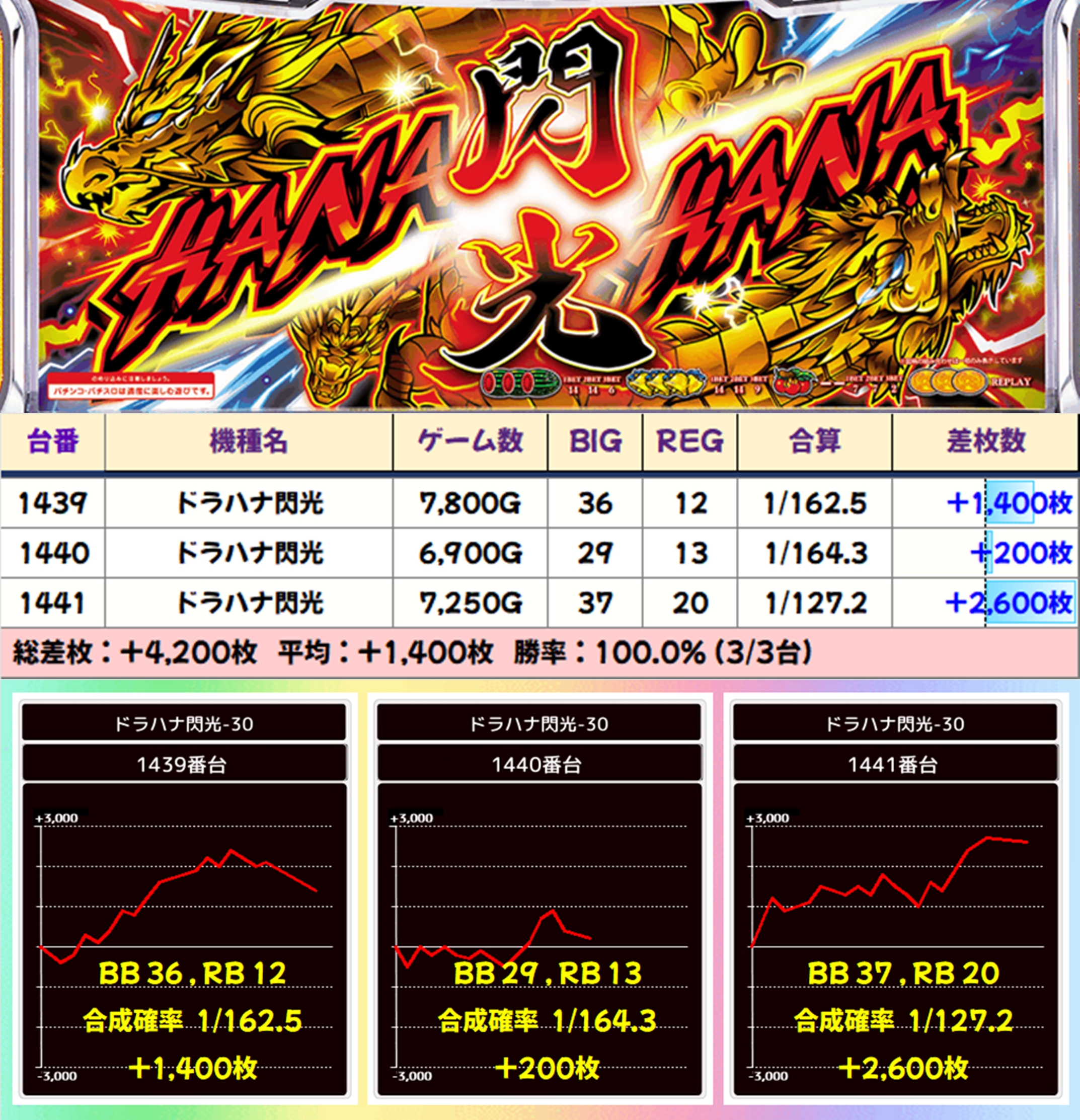 【3台並び】ドラハナ閃光(1439-1441番台)→平均+1,400枚