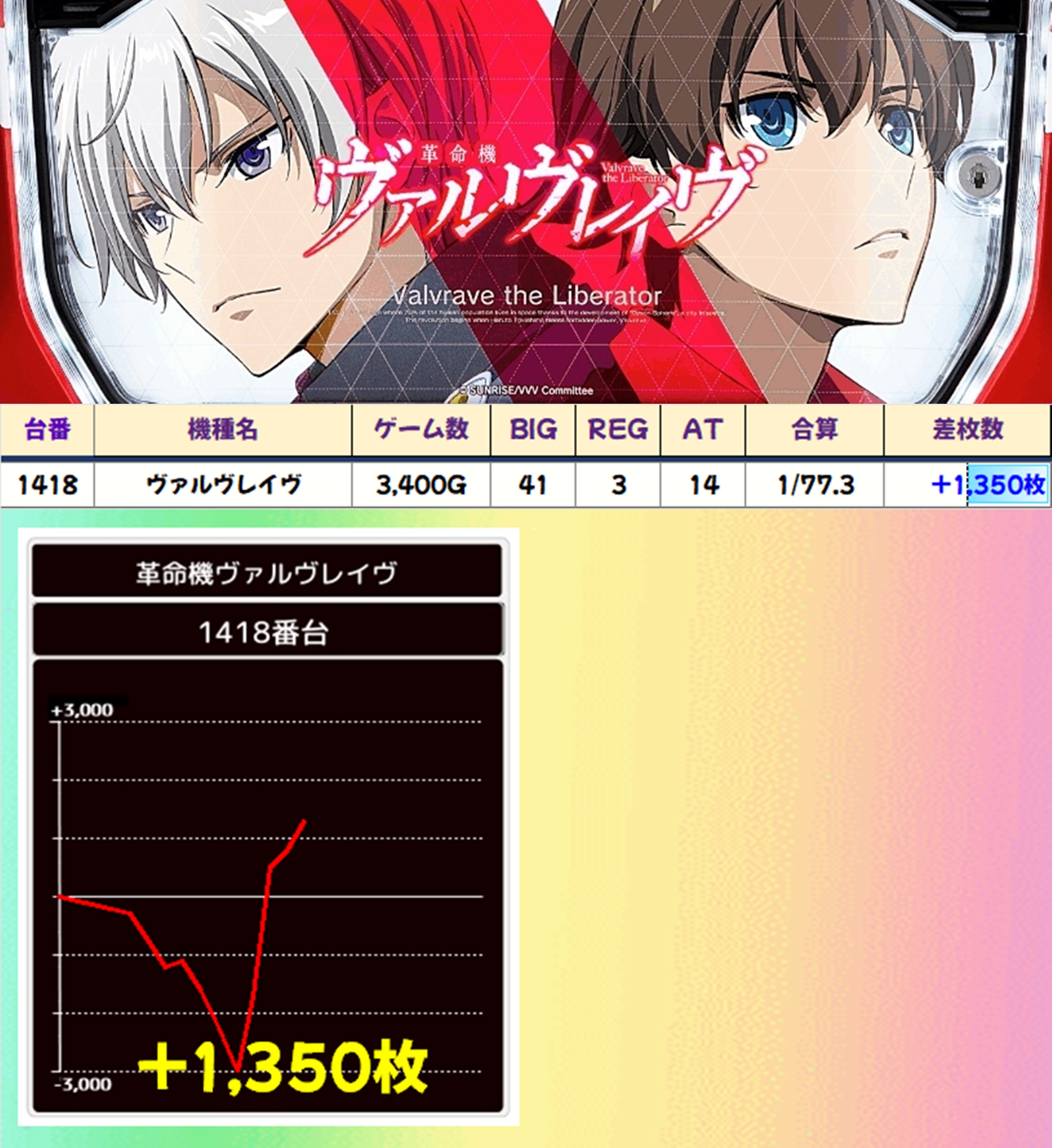 かぐや様に3台並び、モンキーターンVとヴァルヴレイヴ2には4台並びの仕掛けアリ。かぐや様とヴァルヴレイヴ2からは万枚オーバーの大爆発も確認できました。