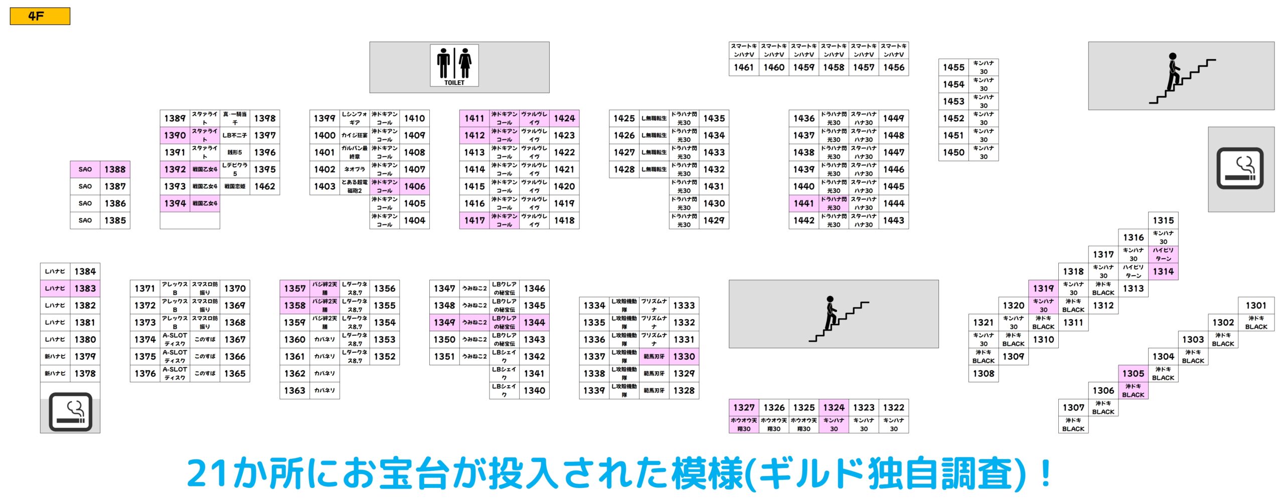過去の傾向として27日までは対象フロアでのお宝台の大量投入に期待できますので、明日以降は積極的に4Fフロアを狙ってみるのも一つの手段と言えますね。