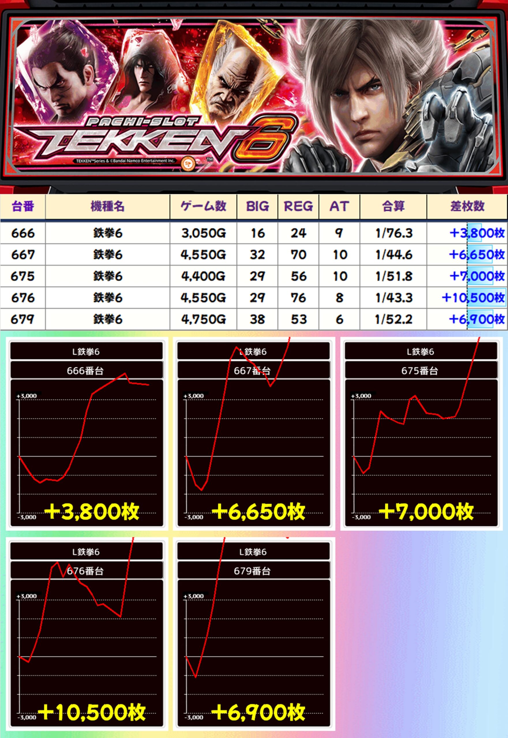 鉄拳6からは+10500枚の万枚超を筆頭に大量出玉が複数出現!