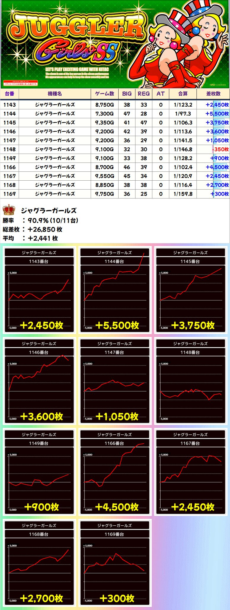 ジャグラーガールズ (10/11台+) ➡平均 +2,441枚