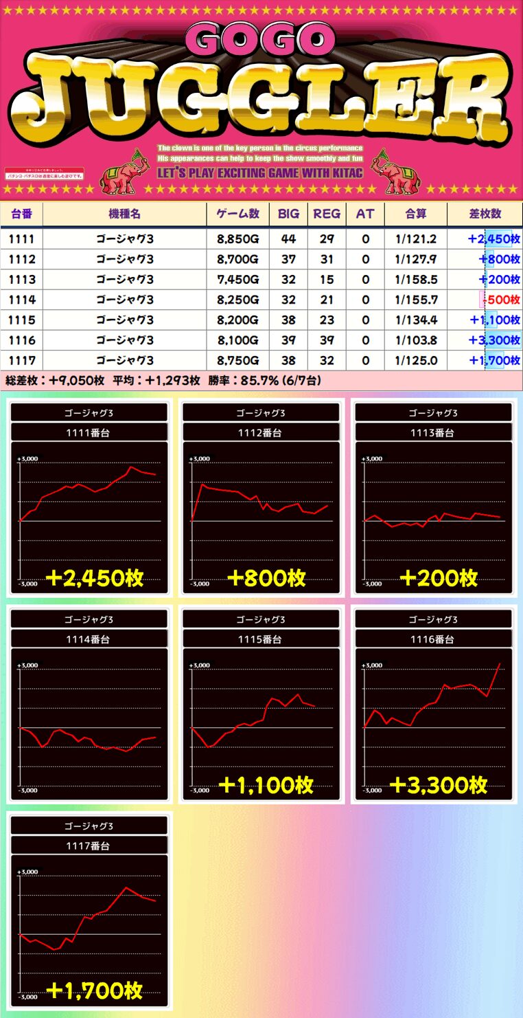 【列仕掛け】1111-1117番台 ゴーゴージャグラー3▶平均+1,293枚