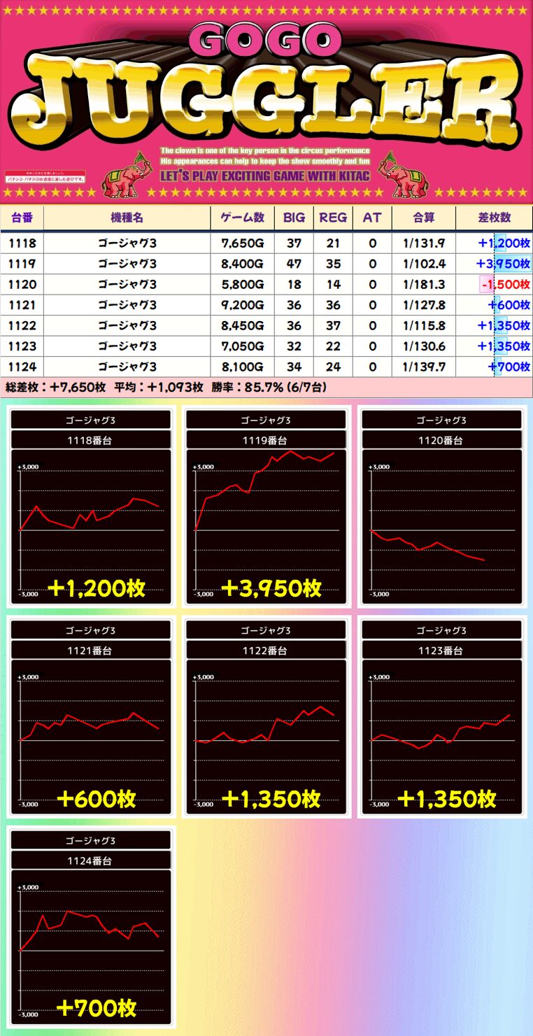 【列仕掛け】1118-1124番台 ゴーゴージャグラー3▶平均+1,093枚