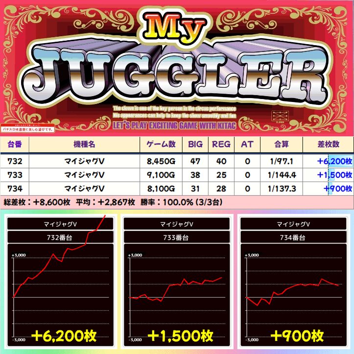 【3台並び】732-734番台 マイジャグラーV▶平均+2,867枚