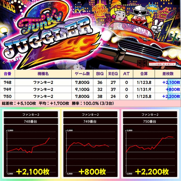 【3台並び】748-750番台 ファンキージャグラー2▶平均+1,700枚