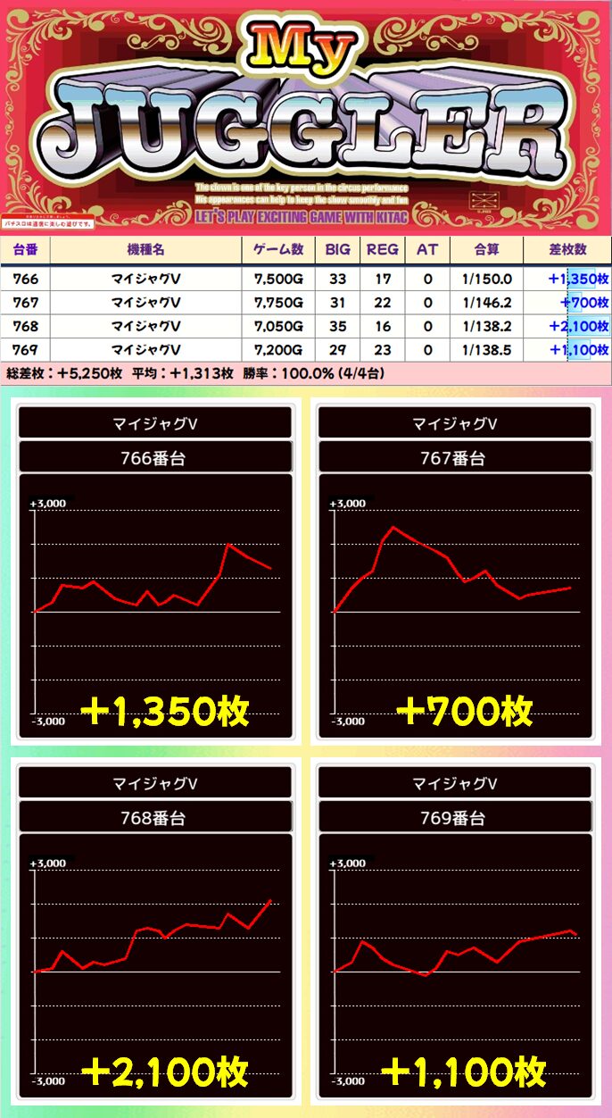 【4台並び】766-769番台 マイジャグラーV▶平均+1,313枚