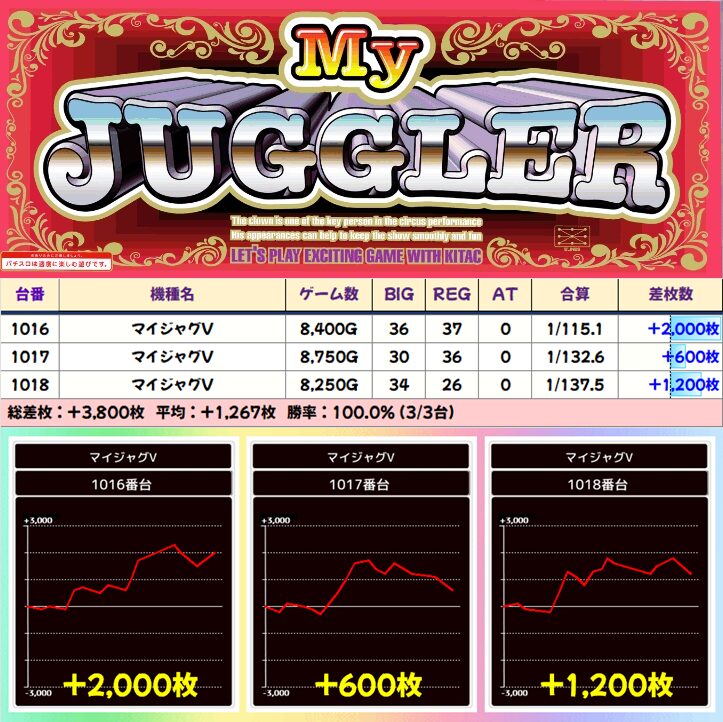 【3台並び】1016-1018番台 マイジャグラーV▶平均+1,267枚
