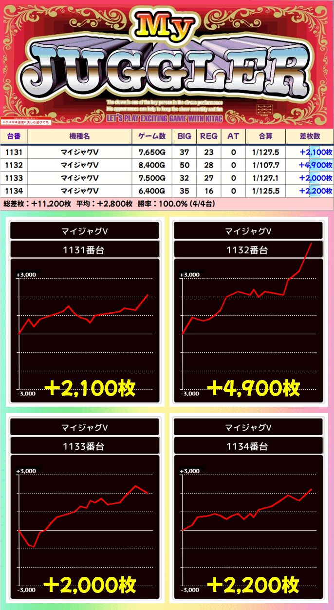 【4台並び】1131-1134番台 マイジャグラーV▶平均+2,800枚