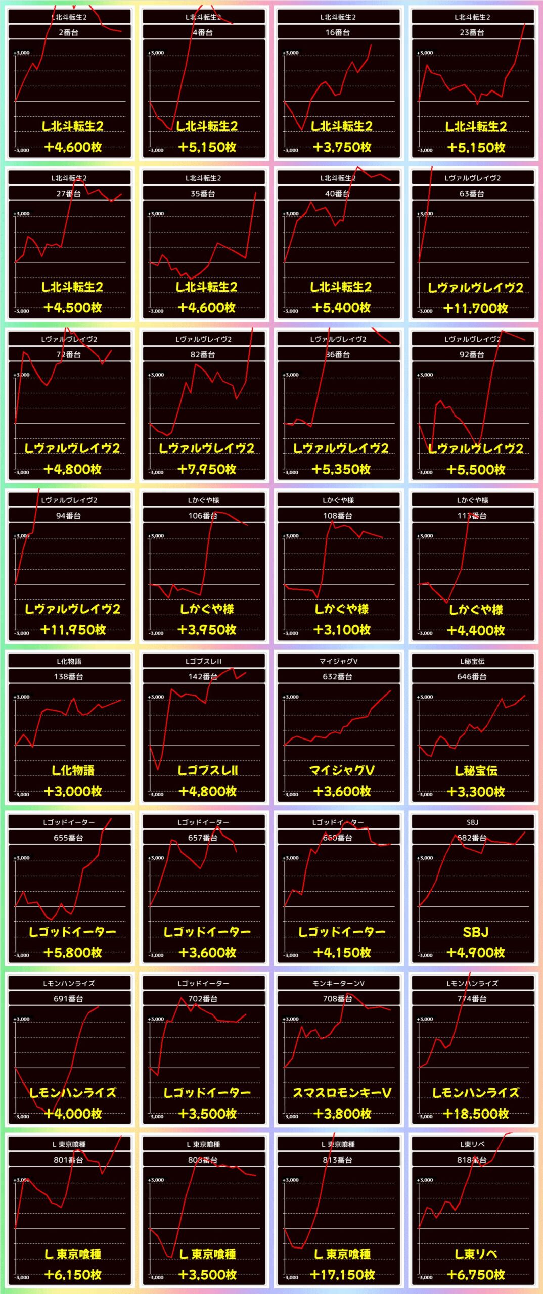 歌舞伎おなじみの並び仕掛けは本日も大量!今回はとにかくジャグからの並び仕掛けが目立つ結果となり、安定したスランプグラフが多数見受けられます。さらにゴージャグからは2か所列仕掛けを確認!