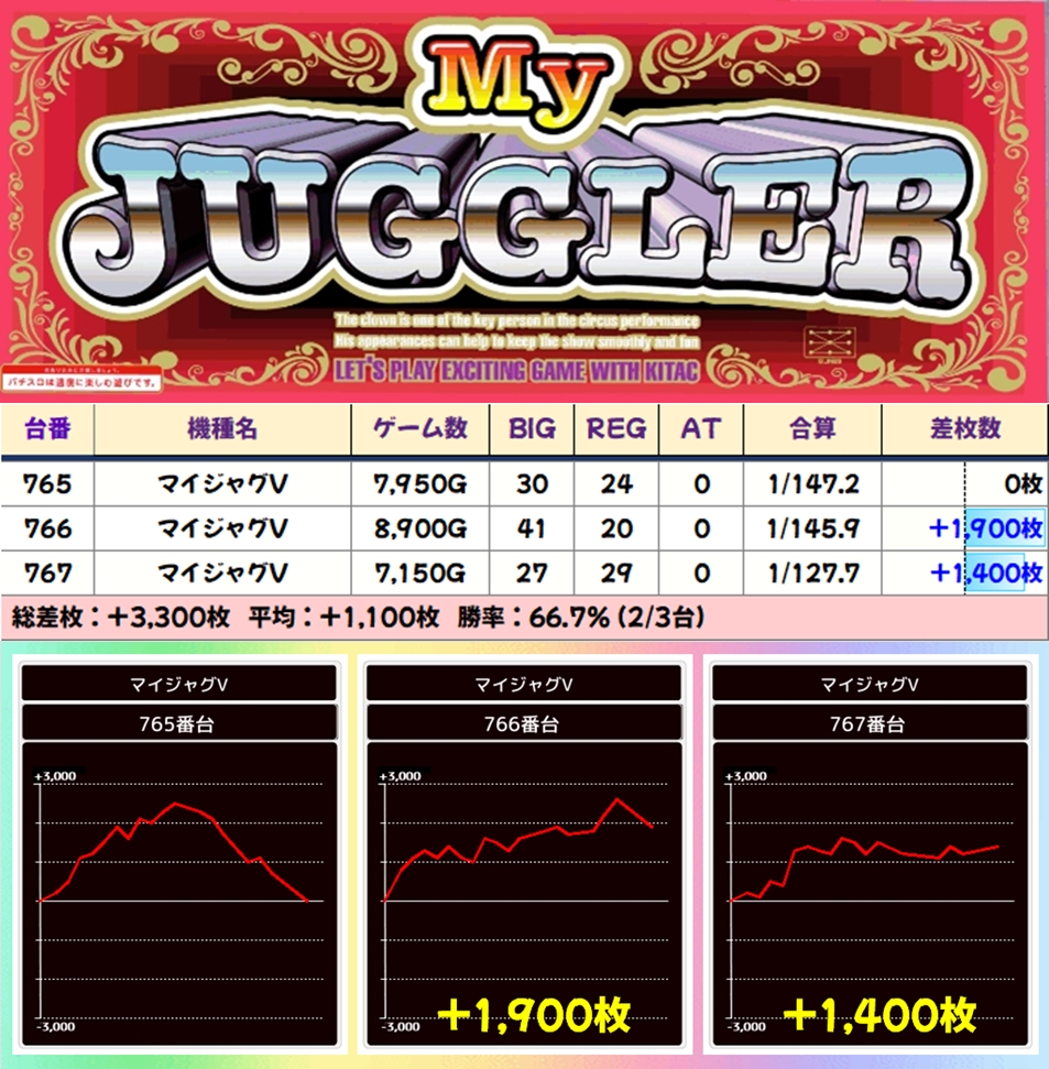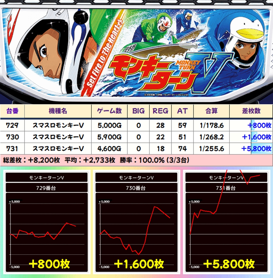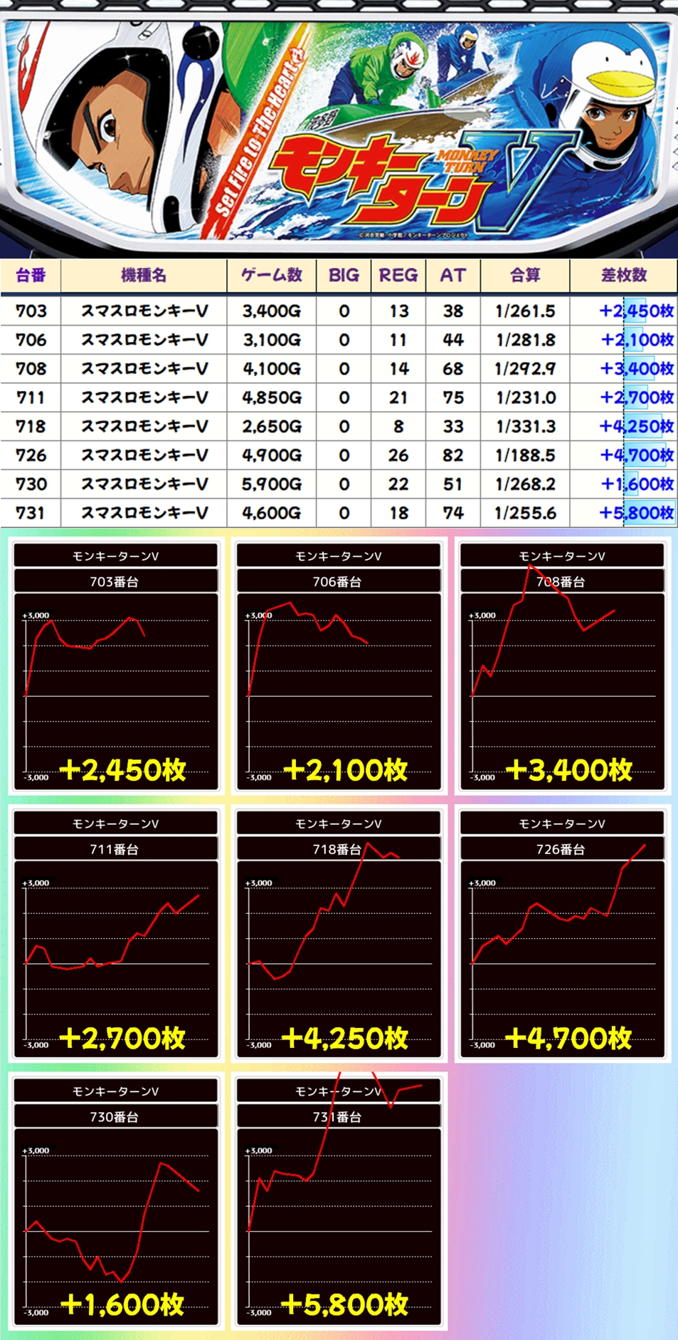 モンキーVは台数が多い中並び仕掛けが2か所もあったことで、2000枚超が大量でした!