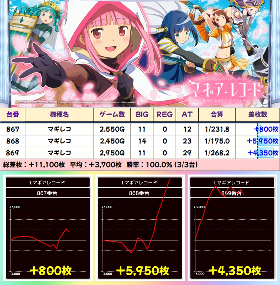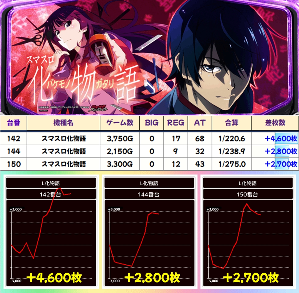 人気スマスロにも3台並びが複数あり!東京喰種から万枚超、マギレコから5000枚クラスが飛び出しました!またハナハナは全系、1/2系、並びと王道仕掛けすべてに絡んでいました!