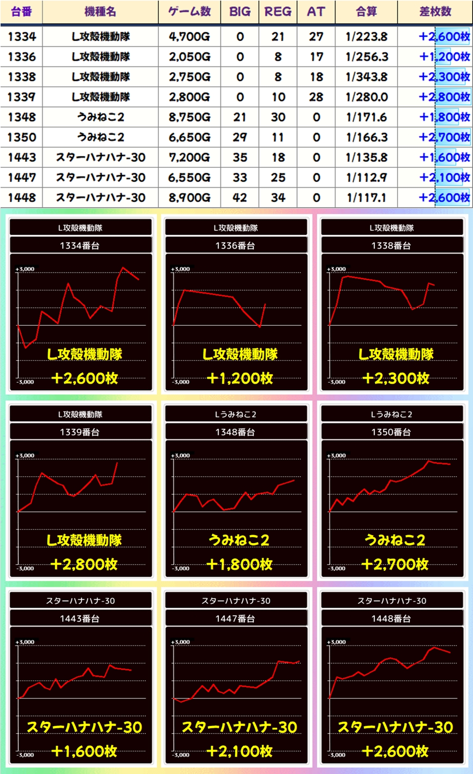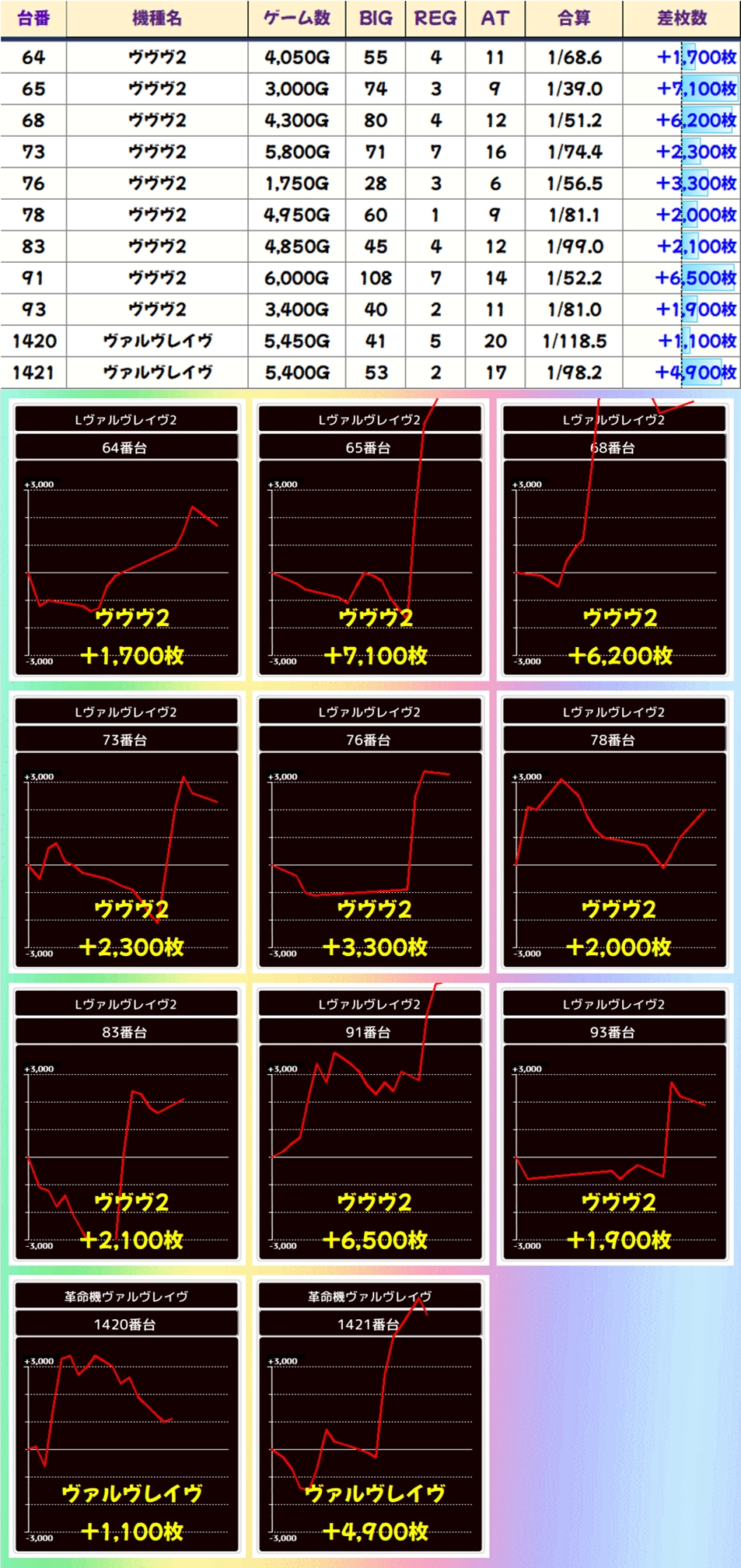 前日が全系だっただけに控えめに見えますが4000枚超や2000枚超台が複数ありました