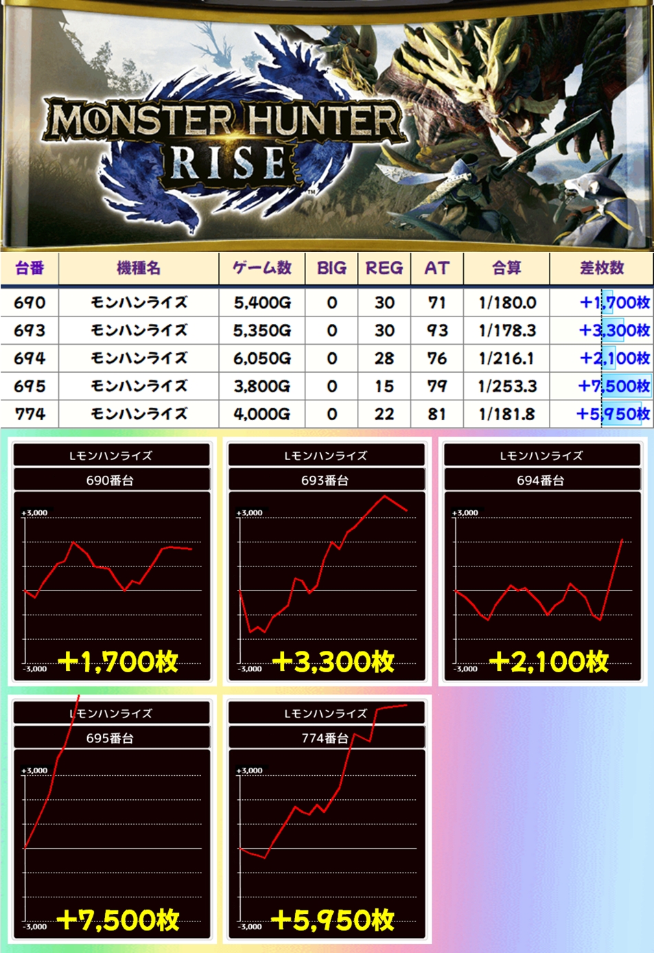 「モンハンライズ」も7000枚や5000枚など大量獲得台あり!