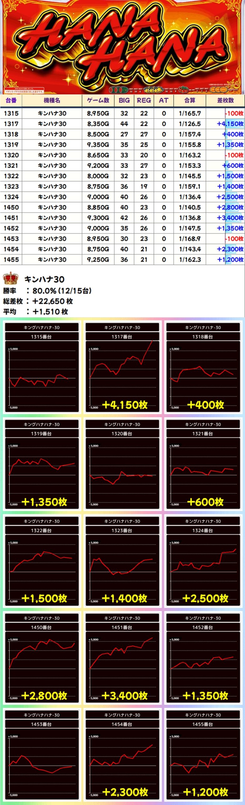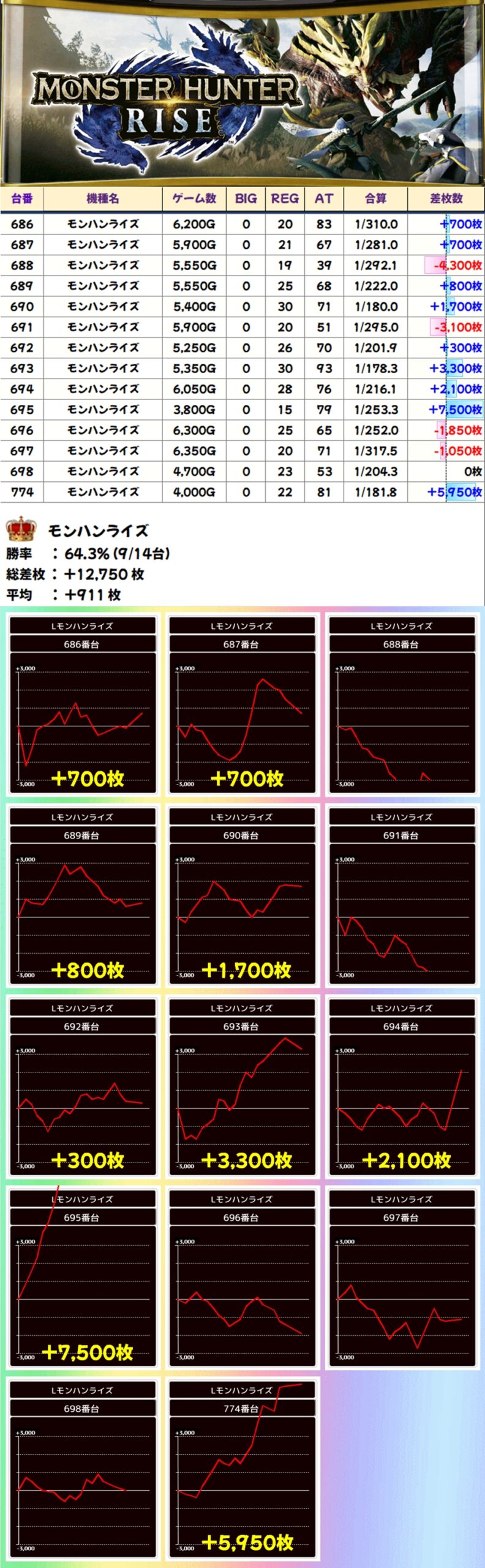 新たな10日間ポスターのモンハンやキンハナ30、ウルトラミラジャグと複数エリアから全系濃厚機種が出現!全系機種は結果はもちろん、稼働も抜群に良いので打ち手もしっかりと粘って残せた結果といえるでしょう!