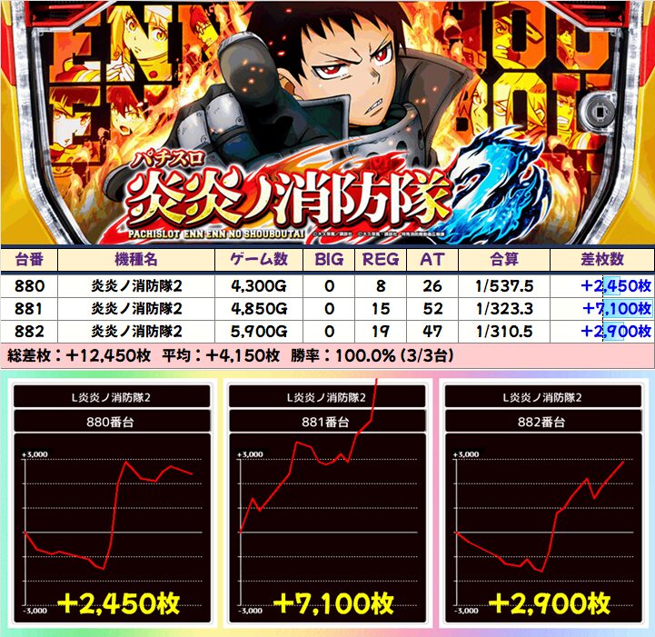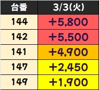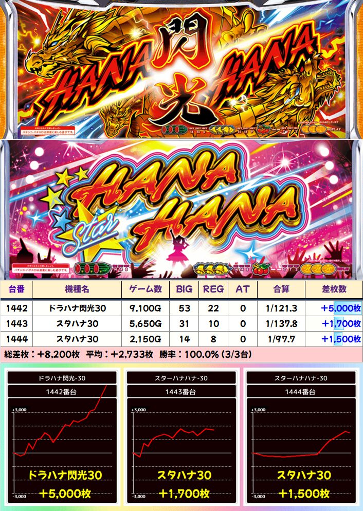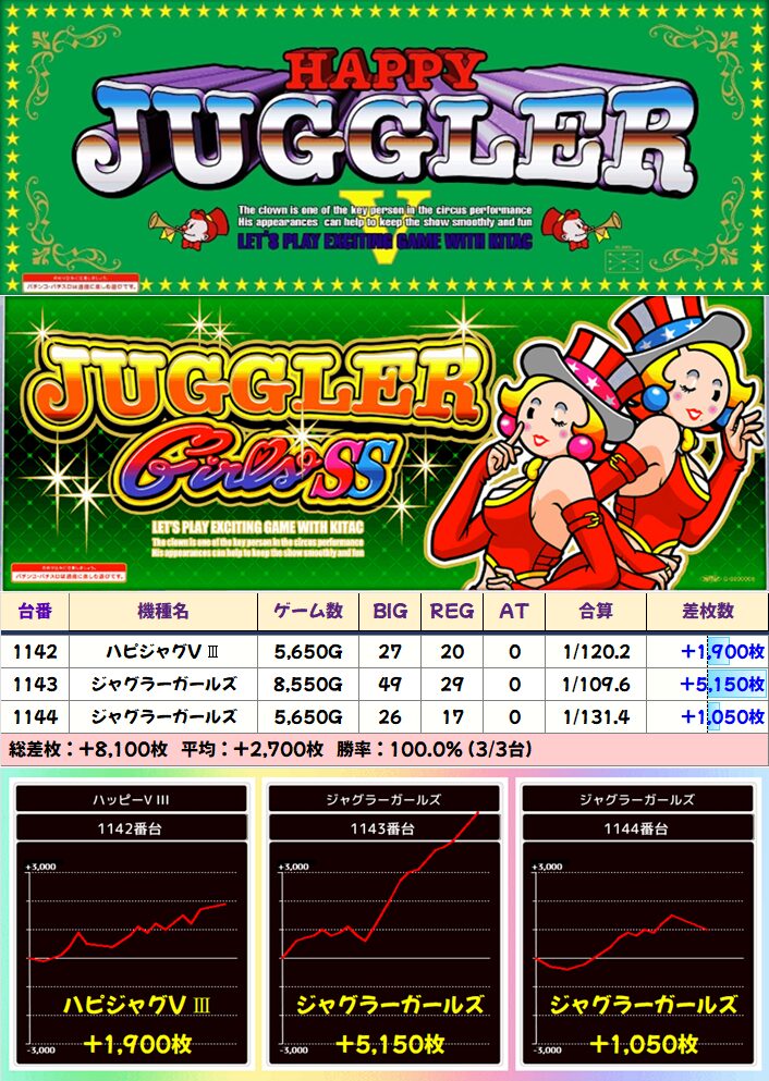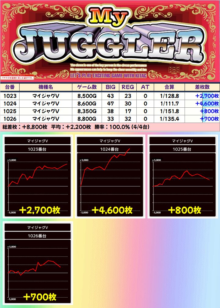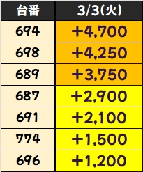 +3400枚を筆頭に3台中2台が+1000枚を突破!