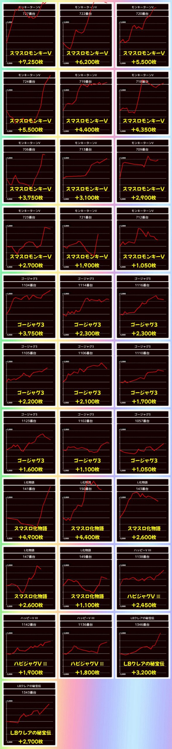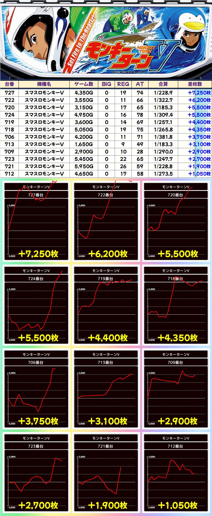 中でも5の日機種でもある「モンキーV」は10台列など優秀台が山盛り!この機種だけで総差枚+3.2万枚と機種別でナンバーワン!
