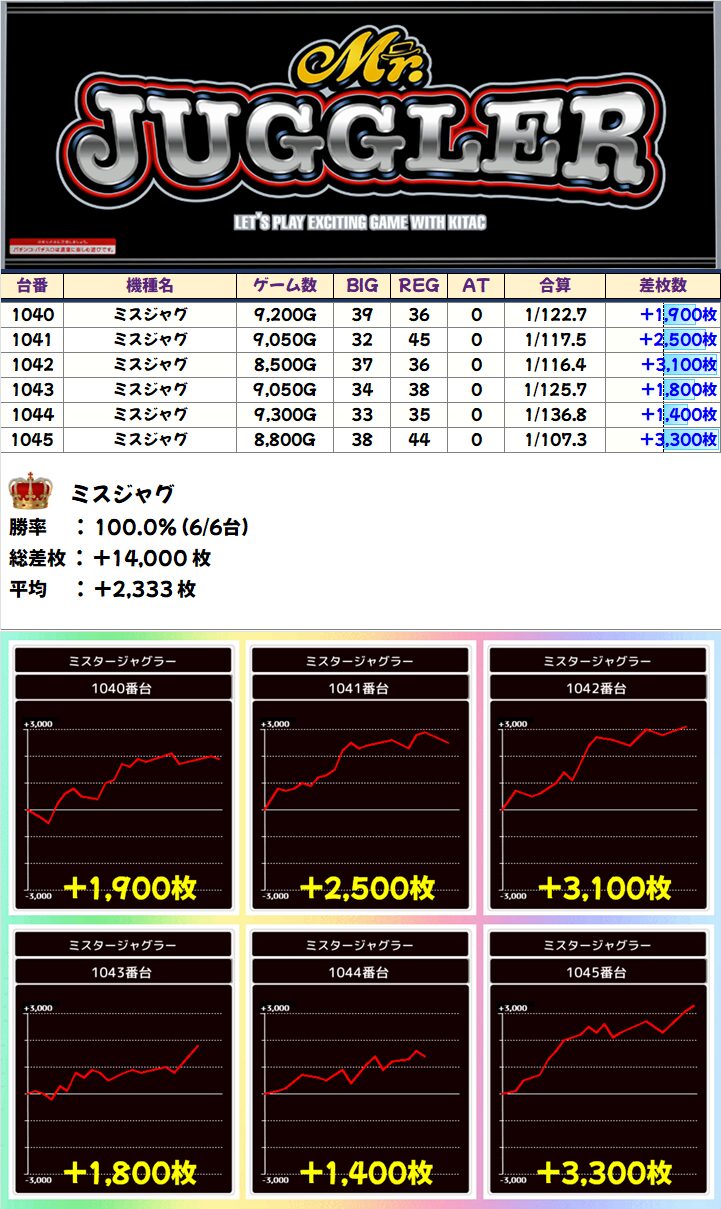 ミスジャグ(6/6台+)➡平均+2,333枚