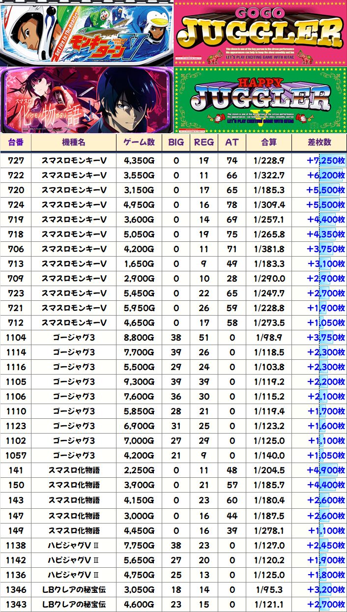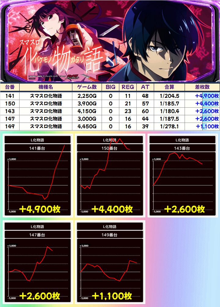「化物語」は前述した通り1/2系濃厚で+4000枚以上×2台など優秀台が続々!