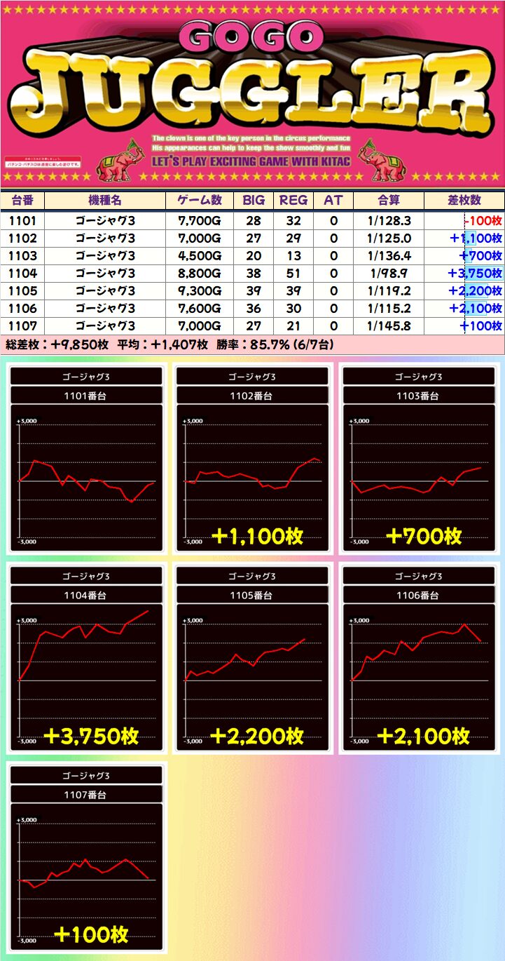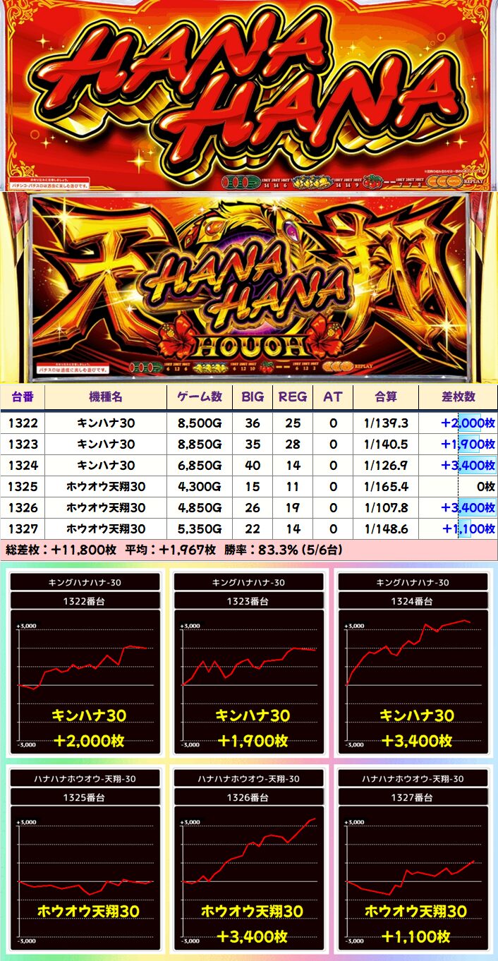複数の+3000枚以上など、全6台が+1000枚以上と文句なしの好結果に!