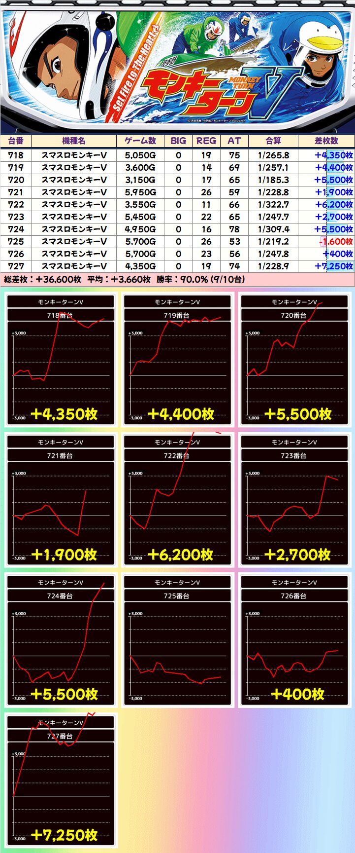 ただ、それだけでは終わらないのが歌舞伎町店!メイン機種の「モンキーV」には10台に及ぶ優秀列も!10台中9台がプラスで平均+3500枚オーバーと抜群でした!
