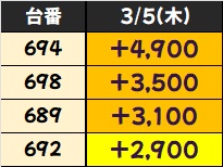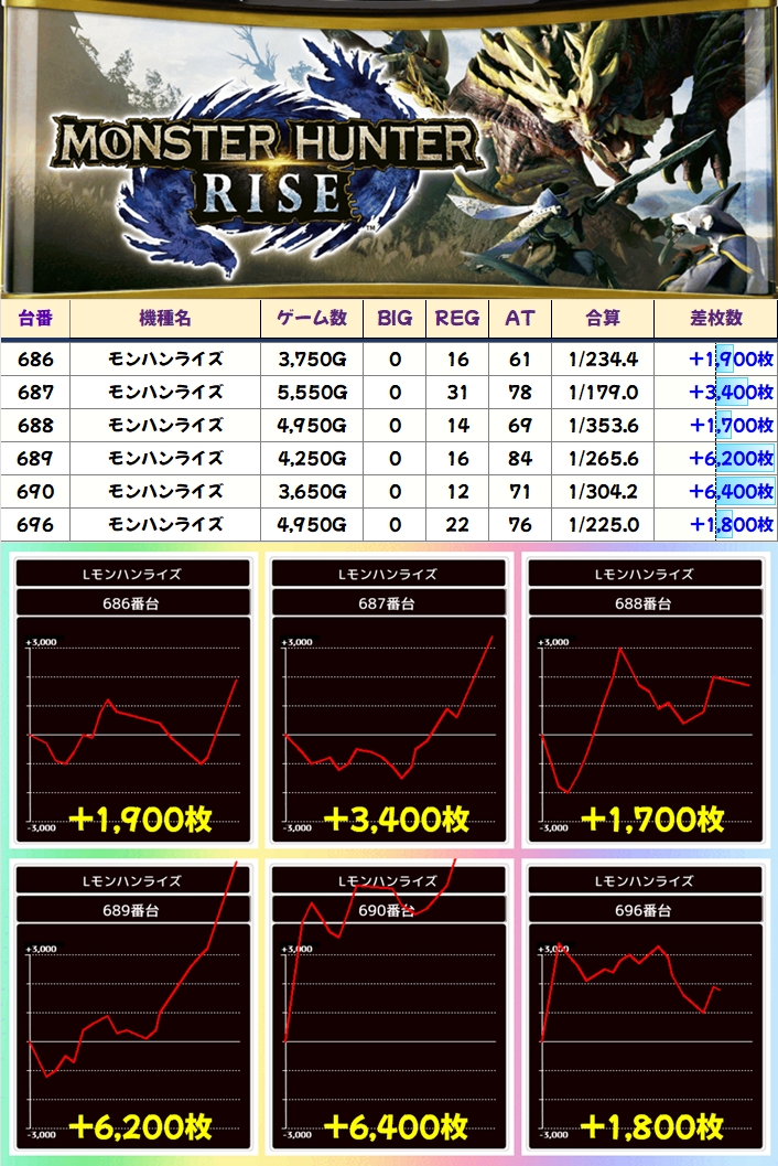 【5台並び】モンハンライズ(686番台〜690番台)→平均+3,920枚(5/5台+)
