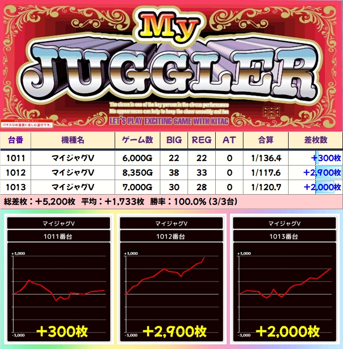 【3台並び】マイジャグラーV(1011番台〜1013番台)→平均+1,733枚(3/3台+)