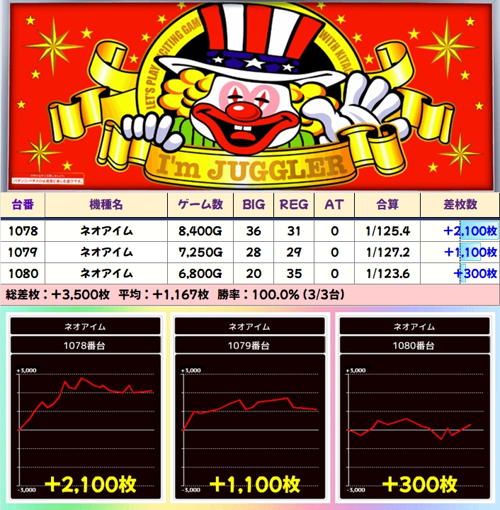 【3台並び】ネオアイム(1078番台〜1080番台)→平均+1,167枚(3/3台+)