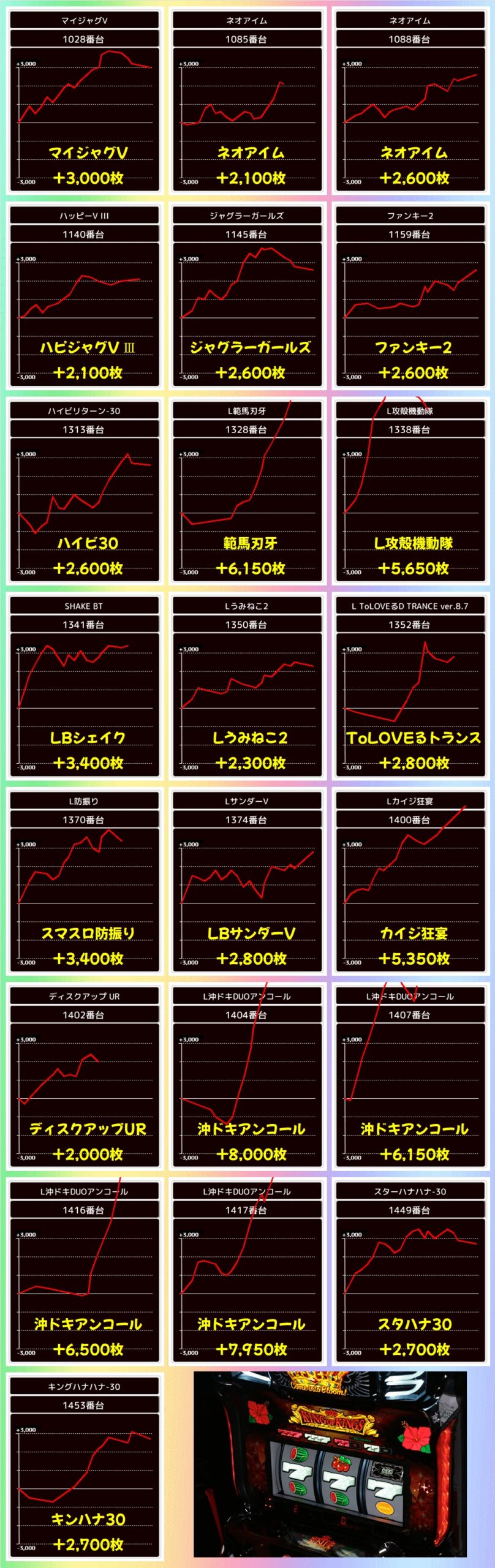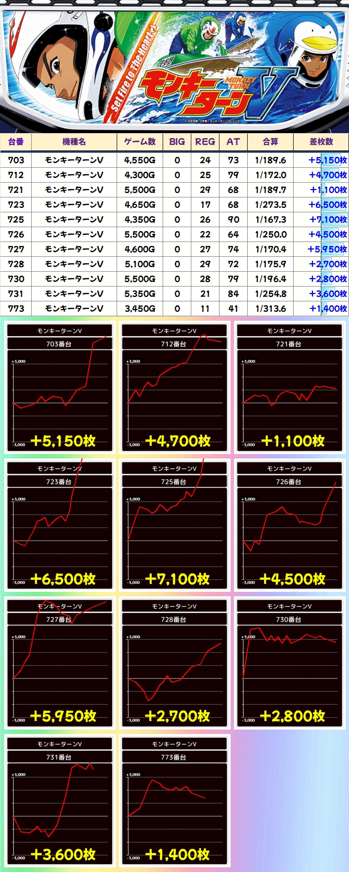 前述した通り、この日はモンキーVにBOX仕掛けと3台並びが用意されており、+7100枚を筆頭に優秀台が続出!