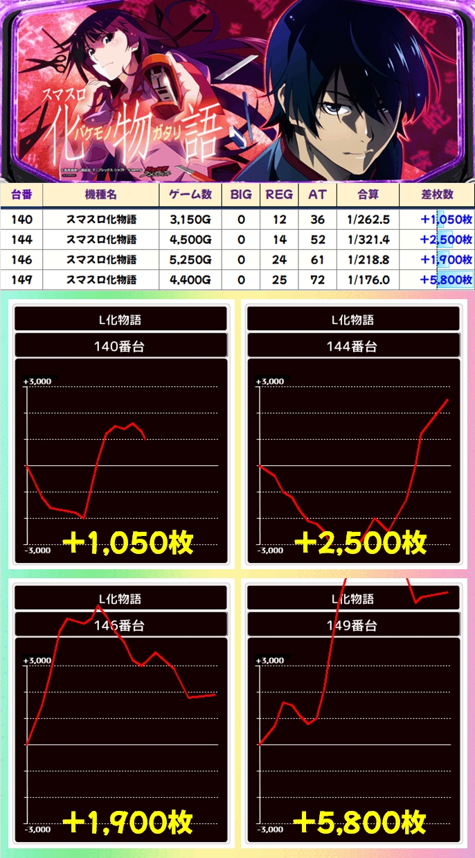 連日優秀台を確認できている化物語からは、本日も+5800枚の大量出玉が出現!