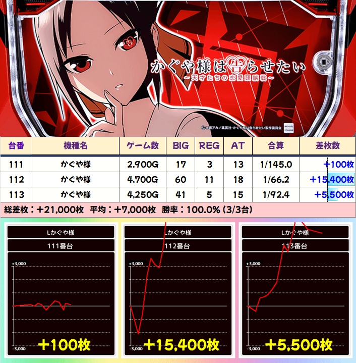 【3台並び】かぐや様(111番台〜113番台)→平均+7,000枚(3/3台+)