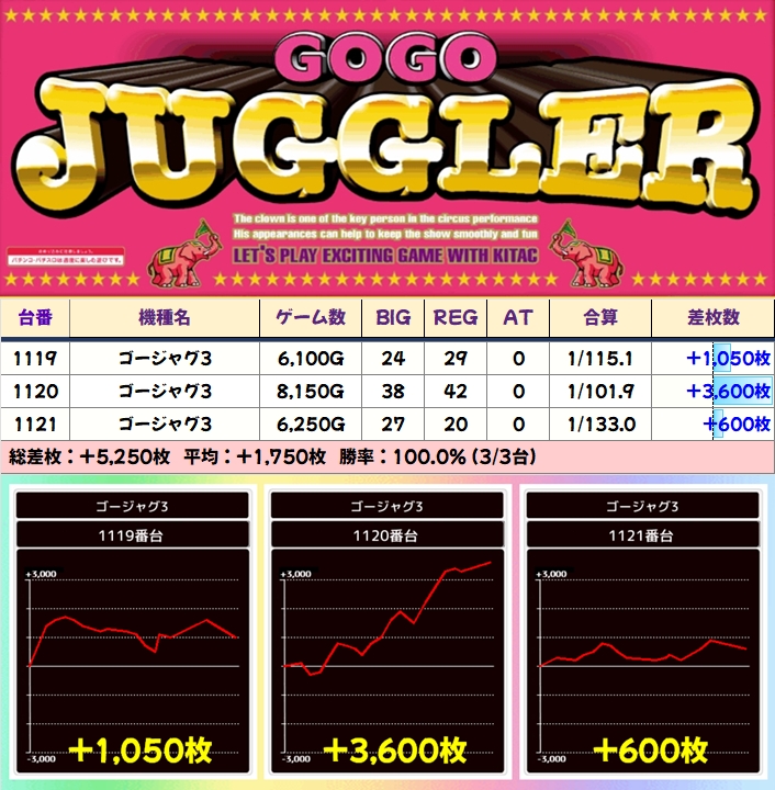 【3台並び】ゴージャグ3(1119番台〜1121番台)→平均+1,750枚(3/3台+)